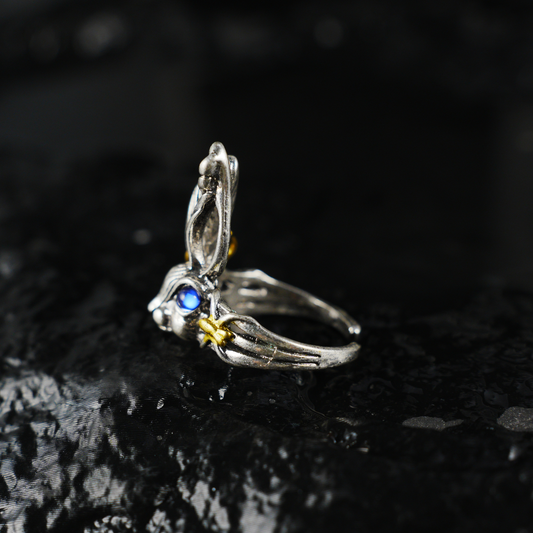 Fantasy Gothic Bunny Ring – Animal Totem Design, Blue-Eyed Rabbit Jewelry, Whimsical Forest Style Gift
