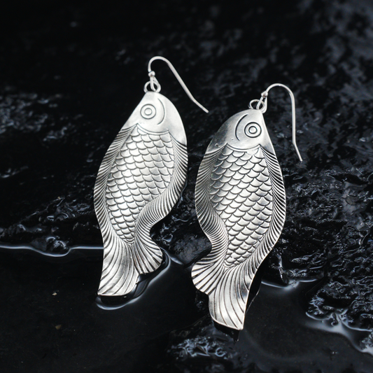 Fish Drop Earrings, Handcrafted Ethnic Style Jewelry, Vintage Carved Fish Design, Spiritual Symbol Gift for Her
