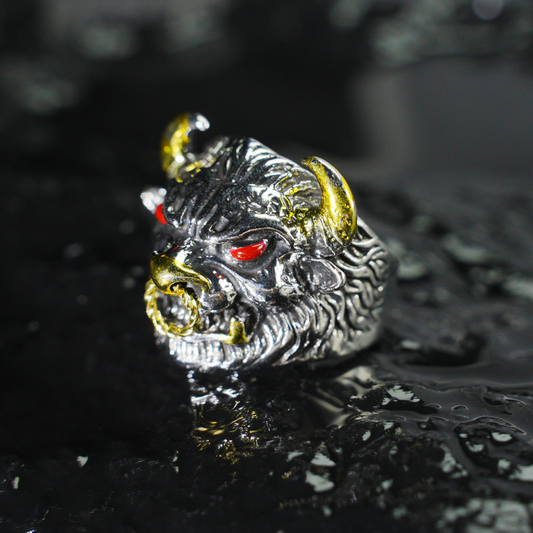Furious Bull Totem Ring | Black-Silver Design with Red Eyes & Golden Horns | Gothic Protective Jewelry | Bold Statement Accessory