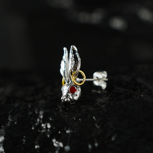Gothic Bunny Stud Earring, Rabbit Head Ear Pin with Red Eyes and Gold Hoop Details, Punk Totem Jewelry for Men and Women