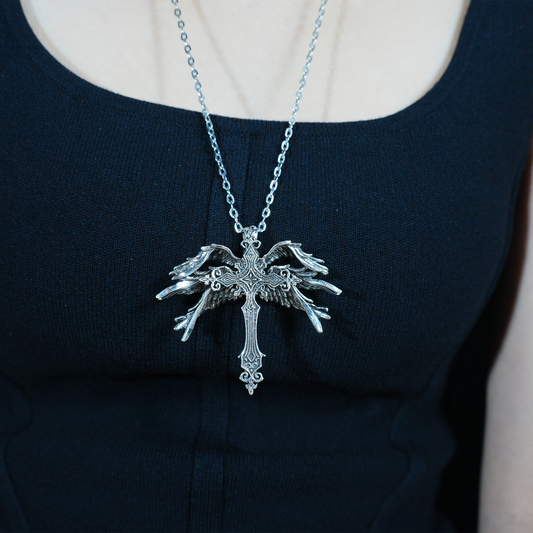 Gothic Cross Necklace with Wings, Angelic Amulet Pendant, Vintage Religious Jewelry, Statement Fantasy Necklace