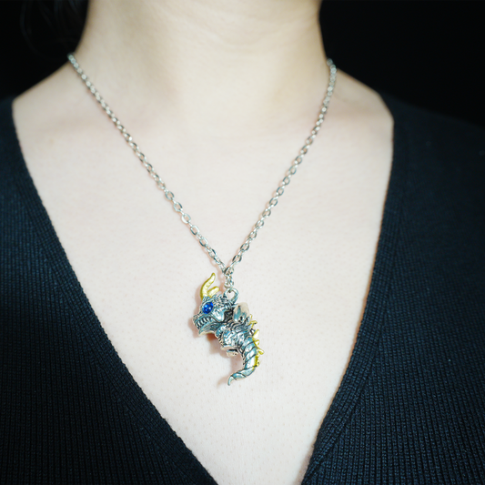 Gothic Dragon Pendant Necklace, Fantasy Guardian Amulet with Blue Eyes, Mythical Jewelry