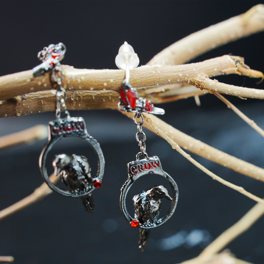 Gothic Raven Drop Earrings with Red Feather Accents | Dark Aesthetic Crow Jewelry | Unique Gift for Gothic and Alternative Fashion Lovers