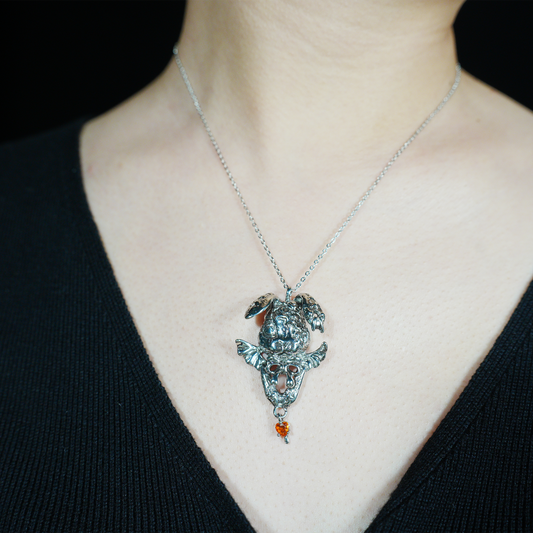 Gothic Winged Bunny Pendant, Orange Heart Gem Fantasy Rabbit Necklace, Gothic Animal Jewelry