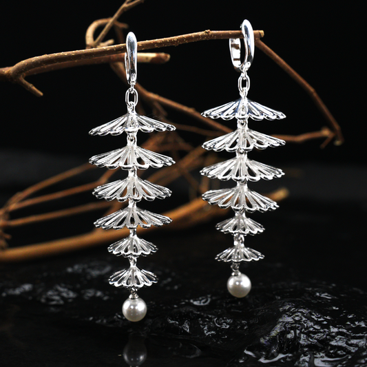 Layered Silver Fan Pearl Earrings, Dangle Drop Earrings, Oriental Art Style Long Statement Jewelry