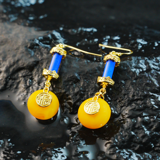 Oriental Vintage Dangle Earrings with Amber & Lapis Lazuli|Lucky Coin Charm Design|Symbolic Amulet Jewelry