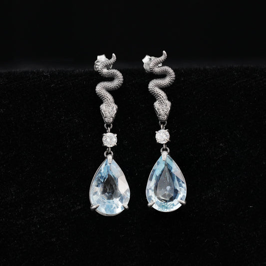 925 Sterling Silver Snake Drop Earrings with Aquamarine | Handcrafted Myth-Inspired Serpent Jewelry for Healing & Protection