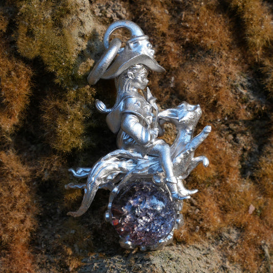 Witch Riding Cat Pendant | 925 Sterling Silver with Phantom Quartz | Handmade Fantasy Jewelry Gift for Magic Lovers & Collectors