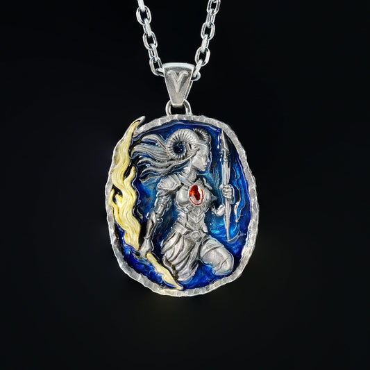 Aries Pendant in 925 Silver | Blue Enamel Medallion with Orange Zirconia | Handmade Zodiac Jewelry