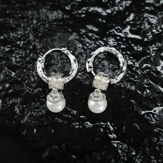 Textured Silver Hoop Earrings with Pearl Drop | Minimalist Retro Design