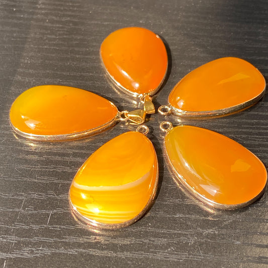 Handgeschliffener ovaler Naturstein Anhänger aus rotem Achat mit goldfarbener Fassung für DIY Schmuckherstellung und Boho Halsketten