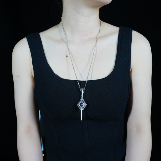 Vintage Gothic Zauberstab Anhänger Halskette, Lila Rot Edelstein Amulett Design, Ornamental Geschnitzter Tropfen, Artisan Statement Schmuck