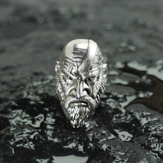 Geschnitzter Kriegsherrenring | Gotisches Design mit gebrochenem Gesicht | Hochglanzpolierte Metallstruktur | Kampfnarben und Bartdetails | Auffälliger Totemring für Herren
