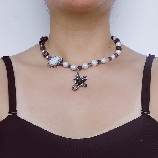 Massive Vintage Barock-Perlen Amethyst Perlenkette|Engelsmuschel-Gravur + Sonnenstein Schlangenmotiv|Heilender Geschenkartikel