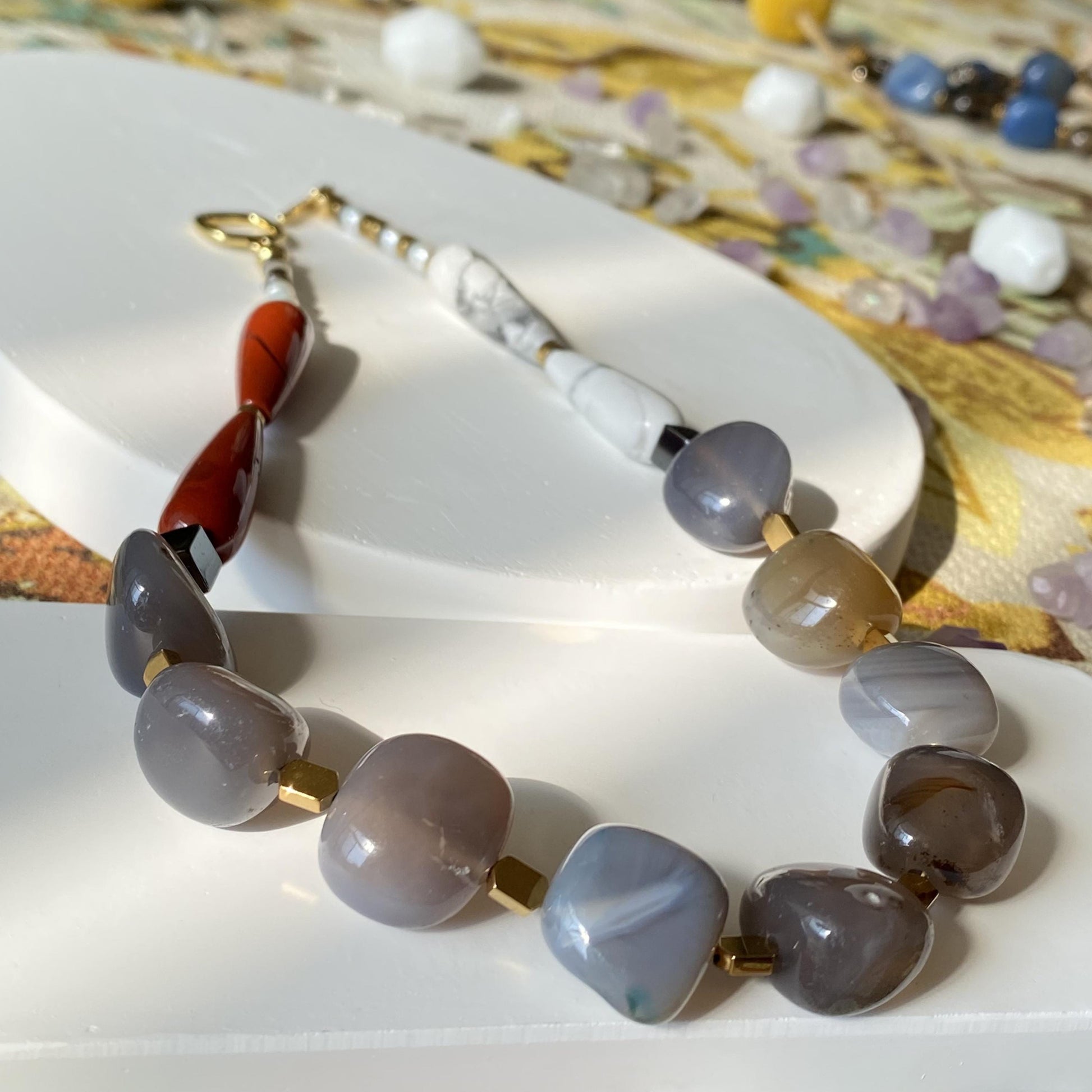 💎 Materialien: Natürlicher Achat (teils mit Kristallstruktur), roter Naturstein, weißer Howlith, Süßwasserperlen, Messingperlen, OT-Verschluss