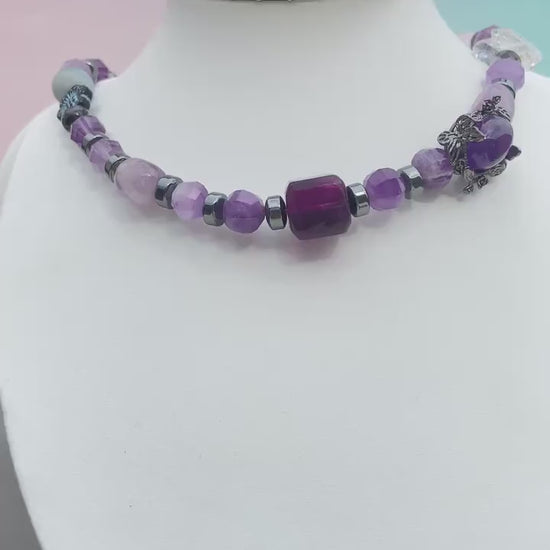 Hauptmaterialien: Amethyst, Fluorit, Bergkristall, Hämatit (Würfel), Achat, Blumen-Zwischenperlen