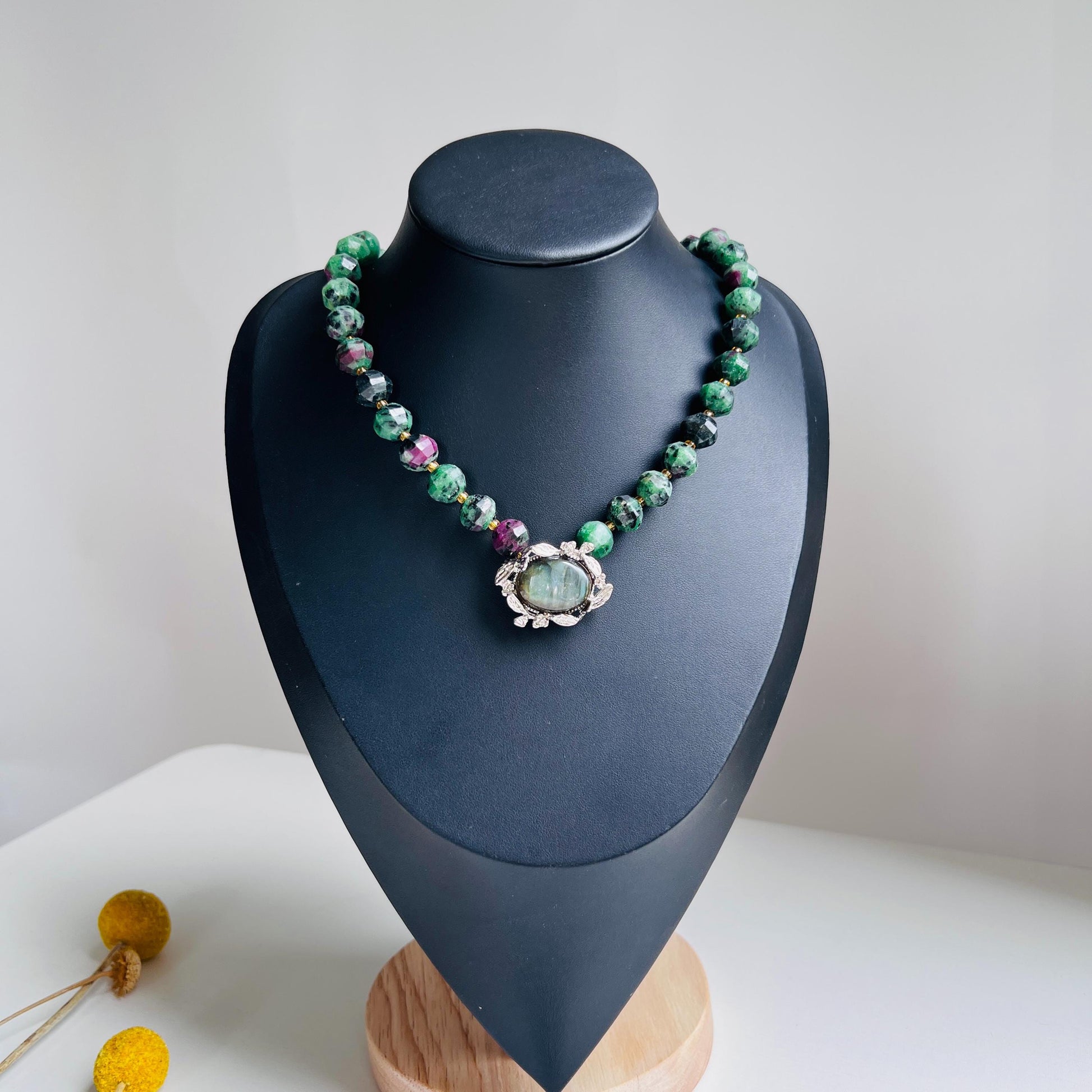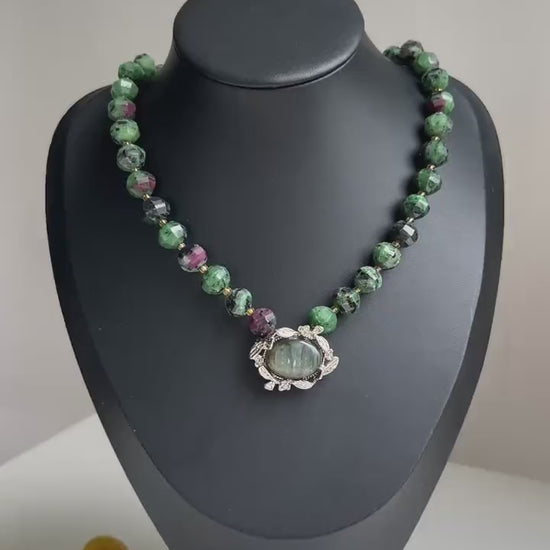 Diese Halskette gehört zum „Magischer Wald"-Stil und besteht aus natürlichem Rubin-Zoisit (smaragdgrüner Ton), kombiniert mit einem Labradorit-Quadratverschluss. Sie strahlt tiefe Grüntöne und geheimnisvolle dunkelviolette Mineralfarben aus. Die Perlen sind facettiert und vielschichtig, mit goldfarbenen Akzenten, die einen vintage- und spirituellen Hauch verleihen. Der lebendige Labradoritverschluss verwendet ein klassisches OT-Design, wie eine magische Barriere, die deine innere Stärke schützt. Es ist nicht nur Schmuck, sondern ein „tragbares Talisman" mit magischem Segen.