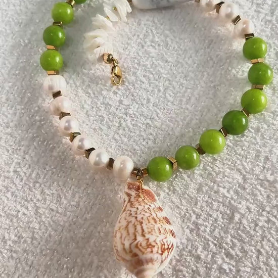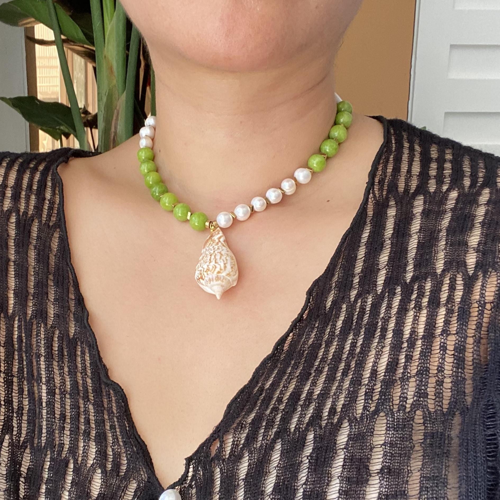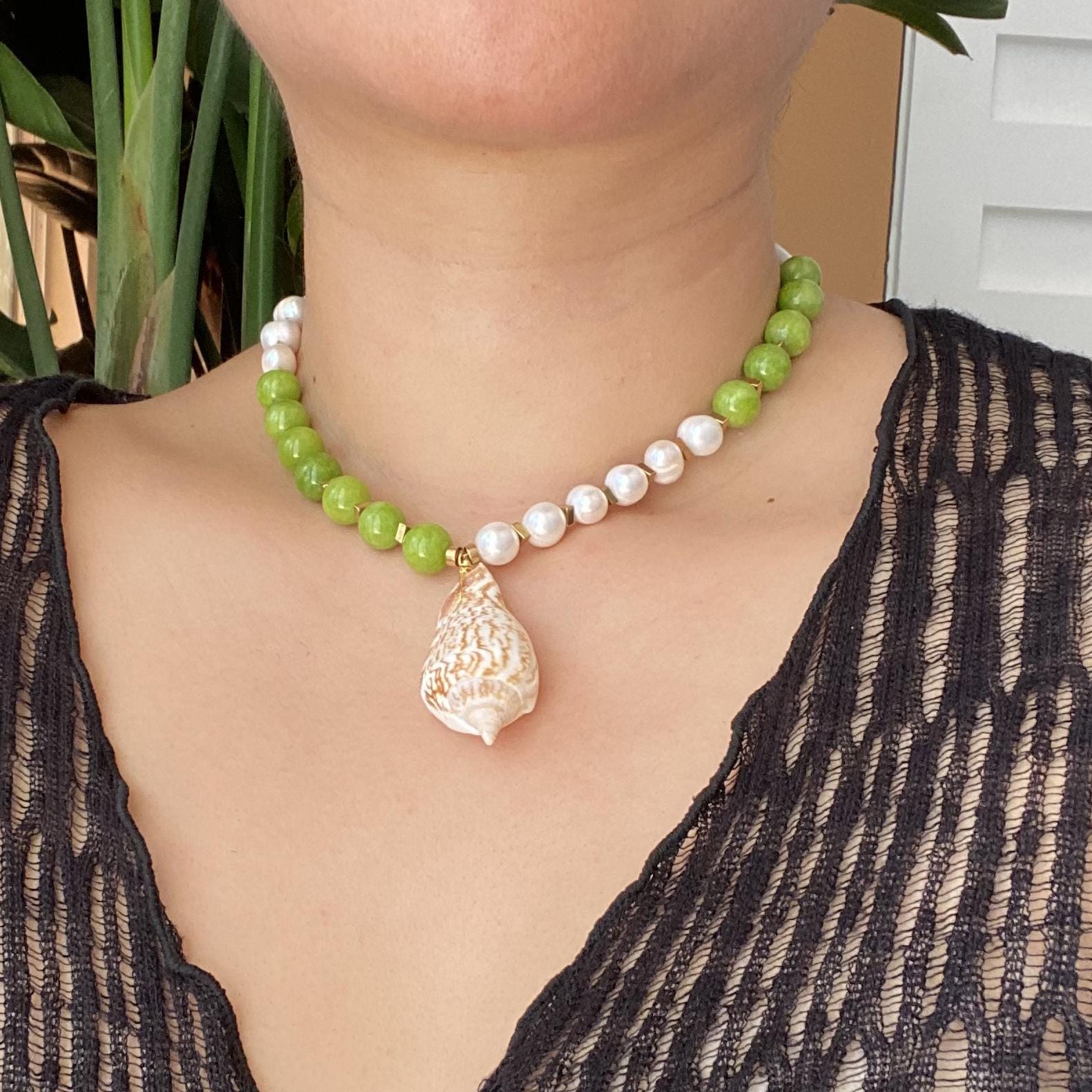 Eine einzigartige Halskette aus natürlichen Edelsteinen, die Sommerfrische und Boho-Stil vereint - mit Peridot, Süßwasserperlen, Howlith, Perlmutt und einem auffälligen Muschelanhänger.