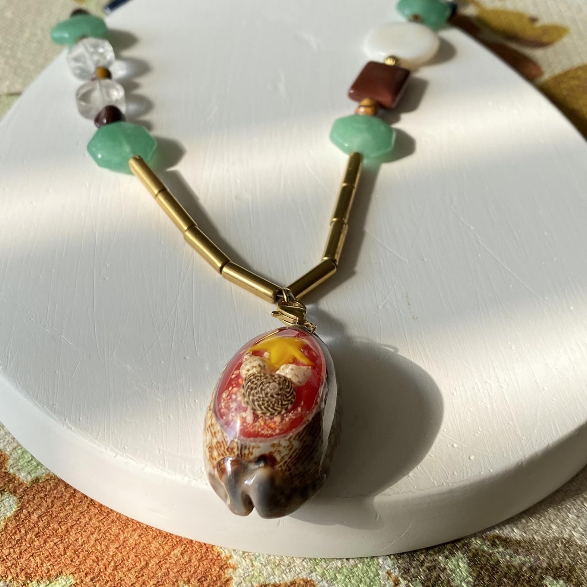 Eine farbenfrohe handgefertigte Edelstein Halskette, die natürliche Schönheit mit künstlerischer Kreativität verbindet. Aventurin, Achat, Rauchquarz, Kristall und Perlmutt treffen auf einen einzigartigen Muschelanhänger mit Harz, der jedes Outfit zu einem echten Statement macht.