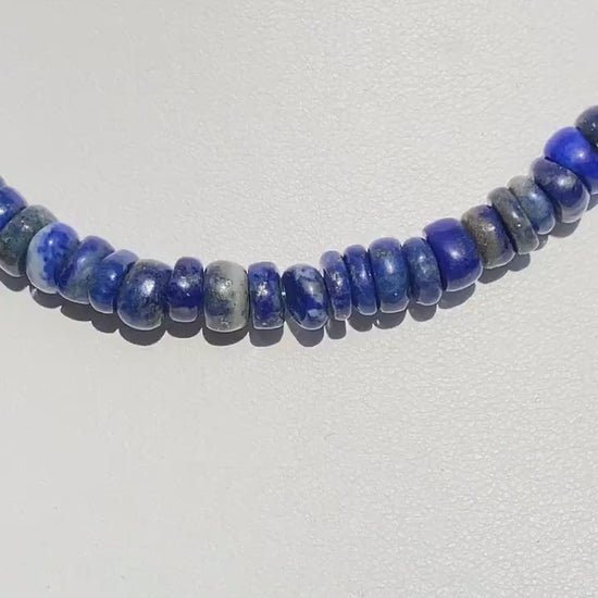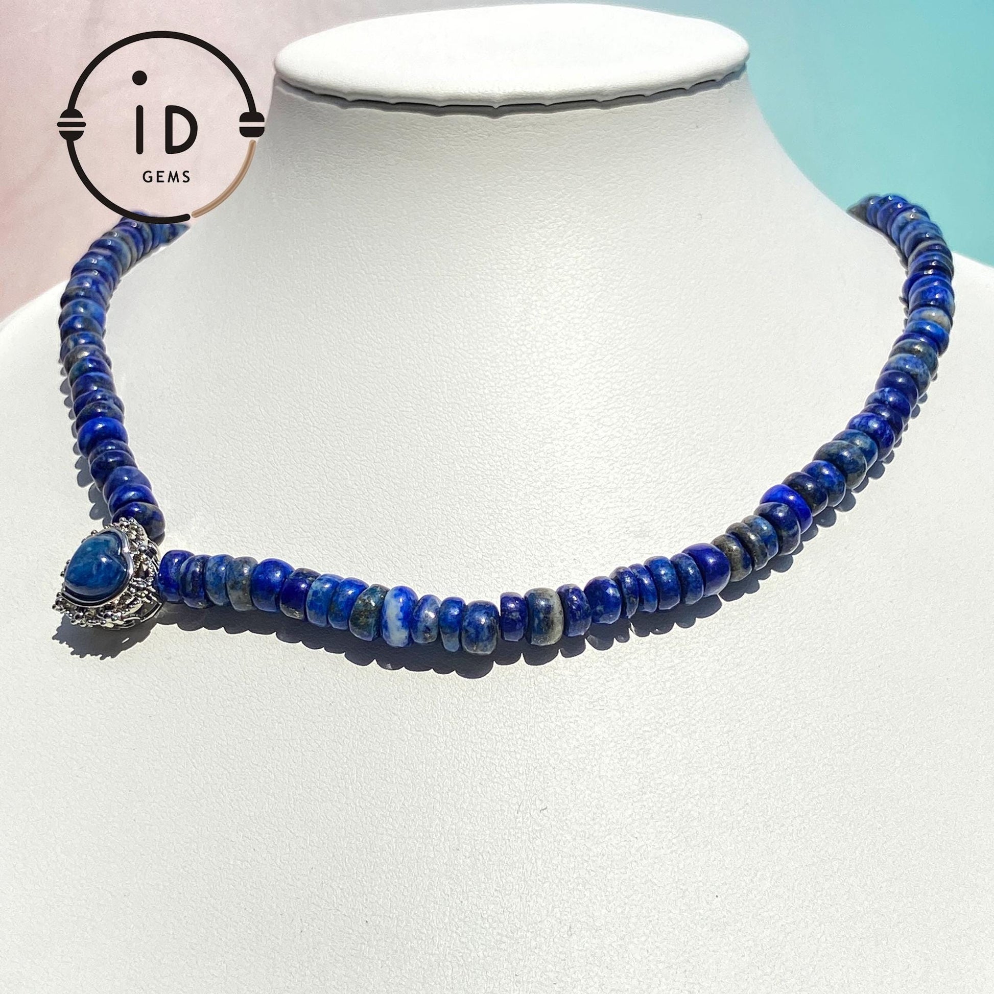 Handgefertigte Lapis unregelmäßige flache Perlenkette | Rohtextur | Industrieller Vintage Silber geschnitzter Herzanhänger | Kühle Perlen
