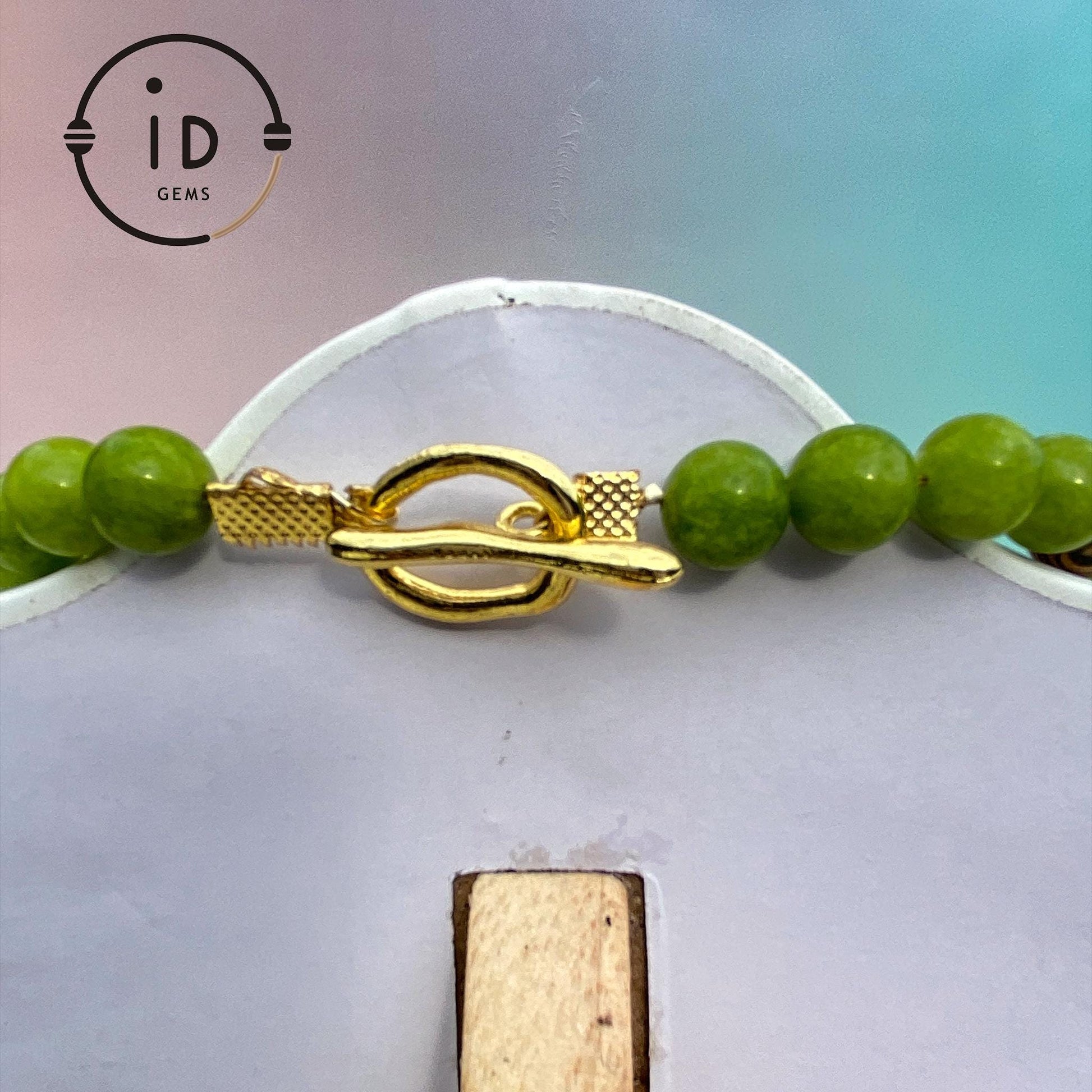 Diese handgefertigte Edelsteinkette ist ein Ausdruck von Lebensfreude, Naturverbundenheit und achtsamer Symbolik. Mit ihrer frischen Apfelgrün-Farbgebung, kombiniert mit goldfarbenen Vintage-Metallelementen, strahlt sie eine einzigartige Mischung aus Naturkraft und nostalgischem Charme aus. Die runden Edelsteinperlen bestehen aus Olivin (Peridot), Fluorit in Würfelform, einem rohen Kristall aus Apophyllit (auch bekannt als weißer Bergkristall), Amazonit-Akzenten, Holzperlen und stilvollen Metallelementen in Form von Schlangen- und Lebensbaum-Symbolen. Diese spirituell aufgeladene Kette ist mit einem hochwertigen, unregelmäßig geformten OT-Verschluss versehen und misst insgesamt 42 cm mit einem Gewicht von ca. 85 g - sie sitzt spürbar, aber komfortabel am Hals.