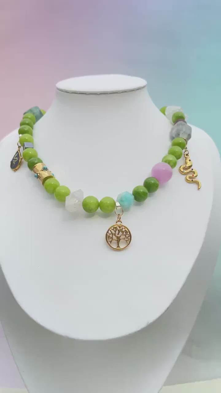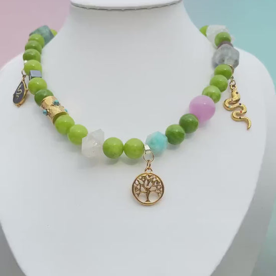 Die verwendeten Edelsteine tragen symbolische Bedeutung: Olivin fördert Regeneration und Vitalität, Fluorit unterstützt Klarheit und Energiereinigung, Amazonit wirkt beruhigend auf Emotionen und hilft beim Stressabbau, während Apophyllit als spiritueller Stein Klarheit und Licht ins Bewusstsein bringt. Der Lebensbaum-Anhänger steht für Wachstum, Verbindung und die Zyklen des Lebens. Die Schlangen-Symbole stehen für Transformation, Energiefluss und Schutz.