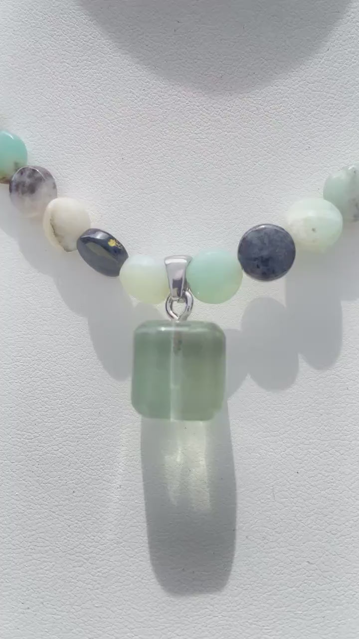 Diese Edelsteinkette wurde mit viel Liebe zum Detail handgefertigt und besteht aus sorgfältig ausgewählten, bunten Natursteinen in sanften Grüntönen, ergänzt durch einen zartgrünen Fluorit-Anhänger in klarer Würfelform. Die Farbstimmung erinnert an eine morgendliche Waldlichtung oder an ruhige Meereswellen - beruhigend, harmonisch und zugleich lebendig.
