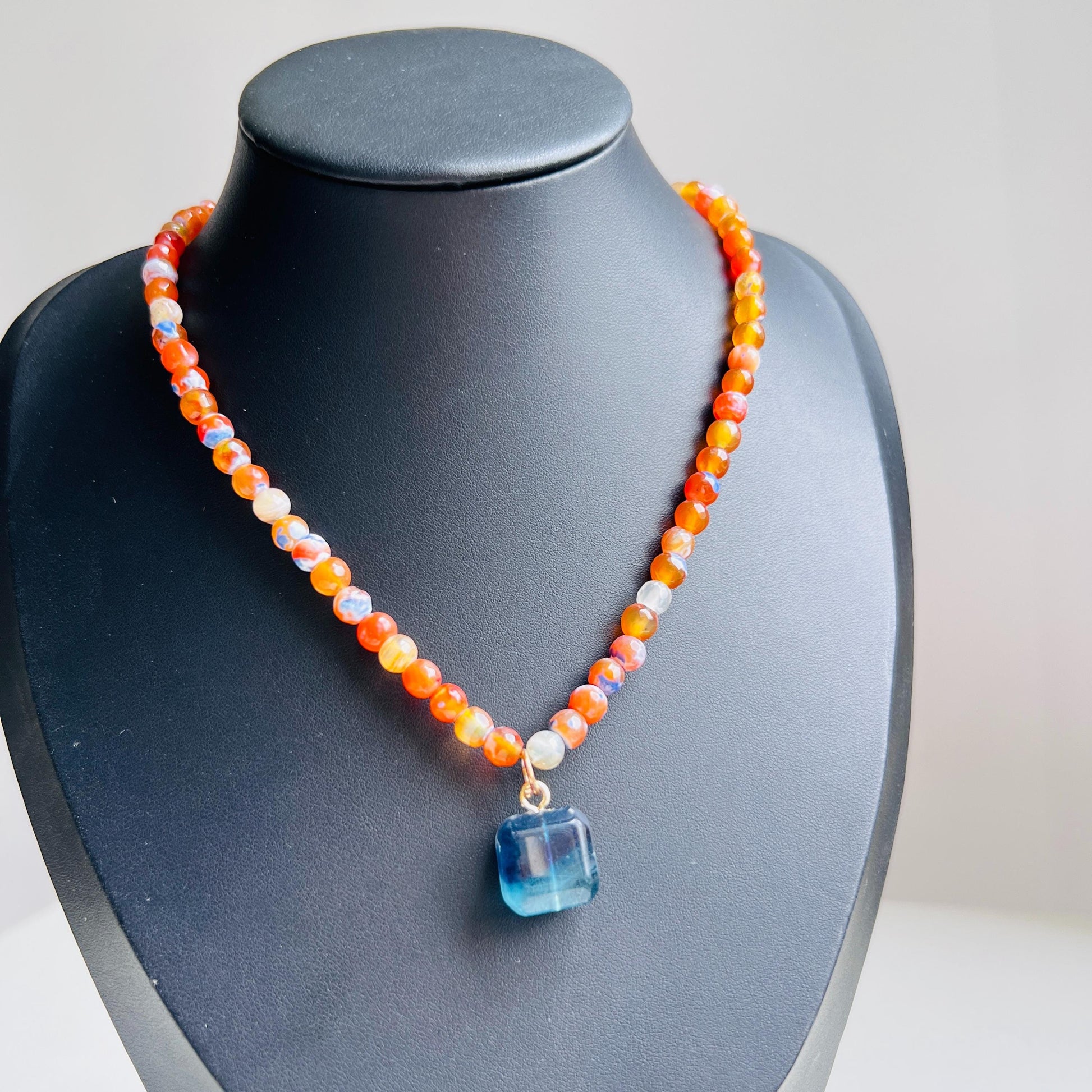 Diese handgefertigte Halskette ist ein farbenfrohes Statement-Schmuckstück für alle, die zarte Leuchtkraft, klare Geometrie und verspielte Natürlichkeit in sich vereinen möchten. Die feinen, facettierten Perlen bestehen aus bunten Achatsteinen, die in warmen Orangetönen, milchigem Weiß und schimmernden Reflexen wechseln. Im Zentrum der Kette befindet sich ein quadratischer Anhänger aus hellblauem Fluorit, der durch seine glatte Transparenz einen ruhigen Kontrast zur lebendigen Struktur der Perlen bildet.