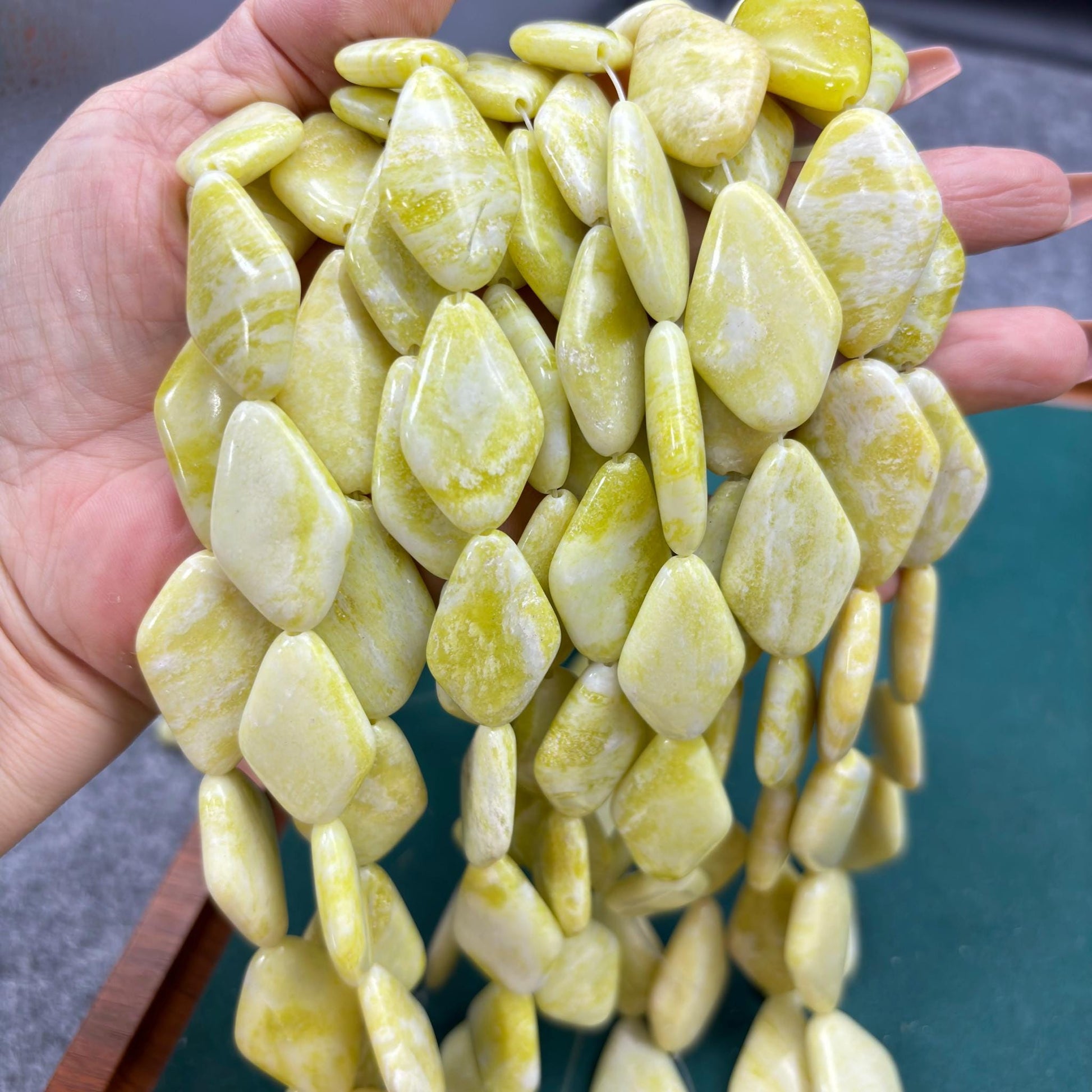 Lemon Jade Edelsteinperlen, polierte Natursteine in Rhombus oder Oval Nugget Form mit Mittelbohrung für DIY Halsketten und Boho Schmuck