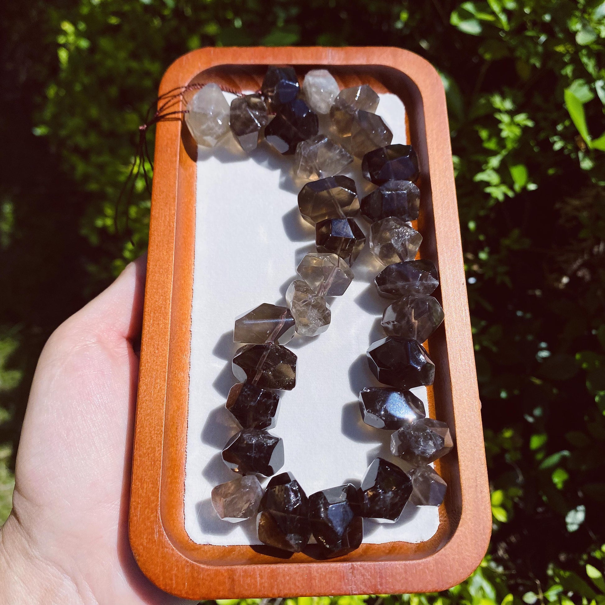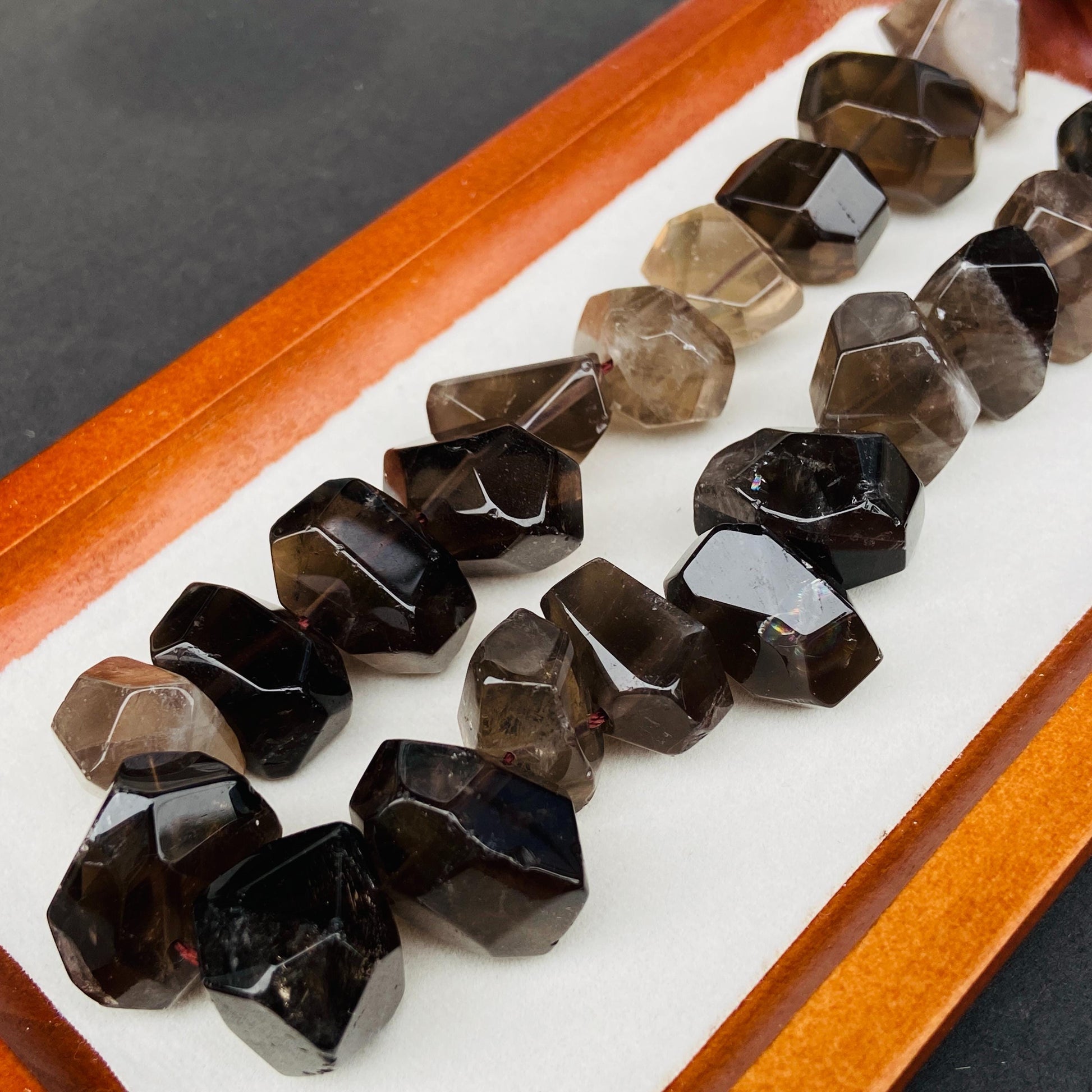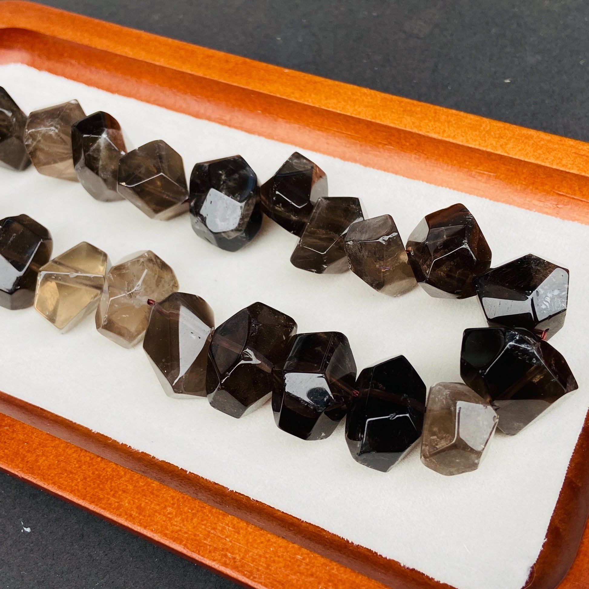 Alle Perlen sind aus echtem Rauchquarz gefertigt. Kleine Unterschiede in Farbe, Schliff oder Transparenz sind normal und machen jedes Stück einzigartig.