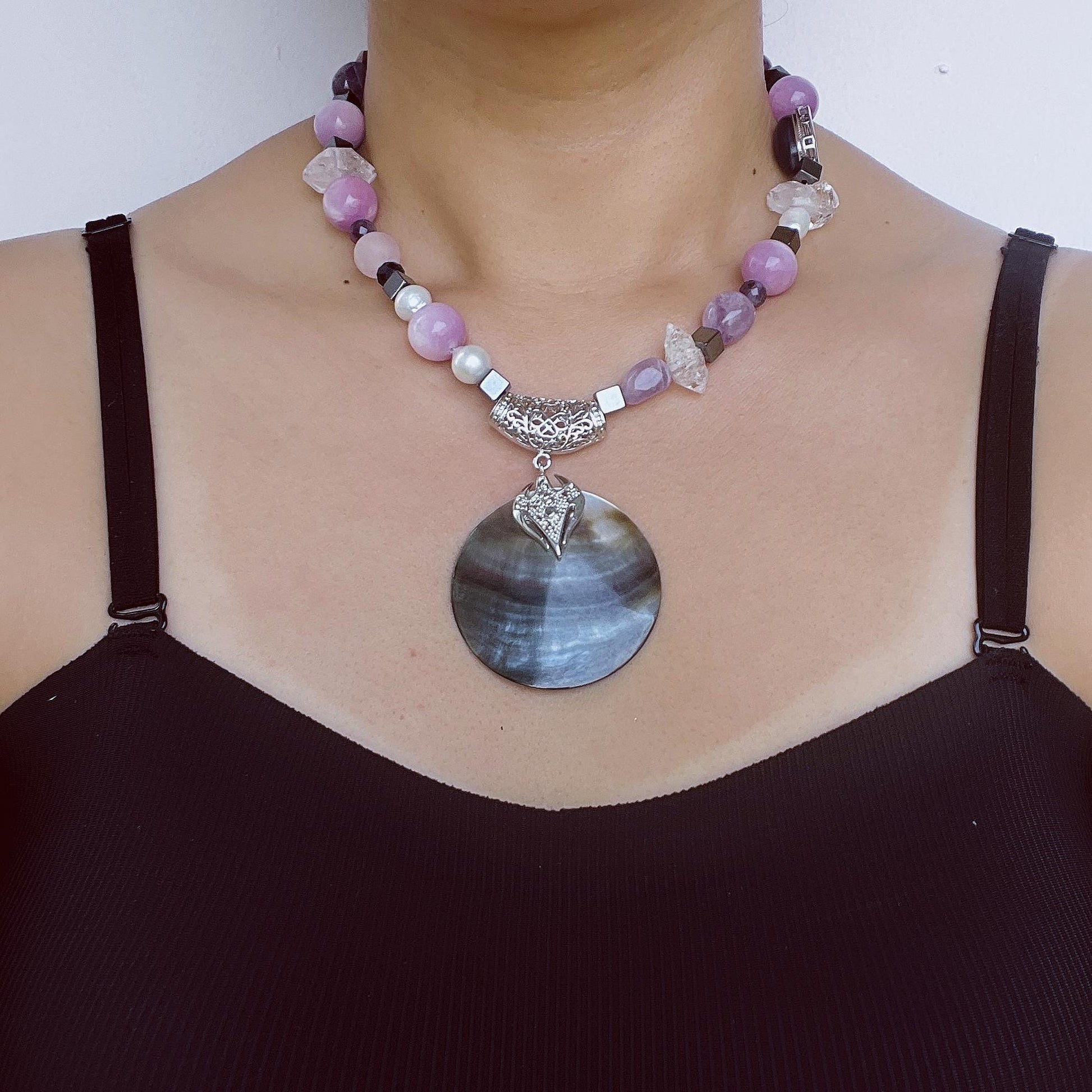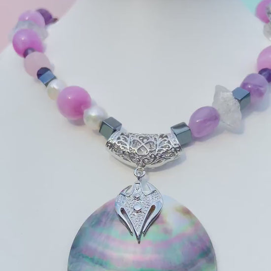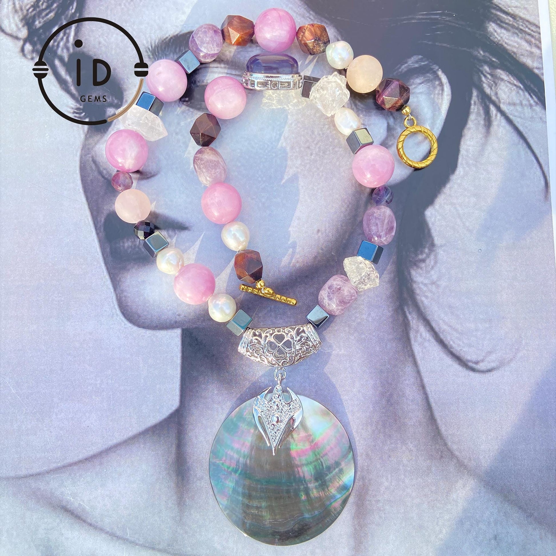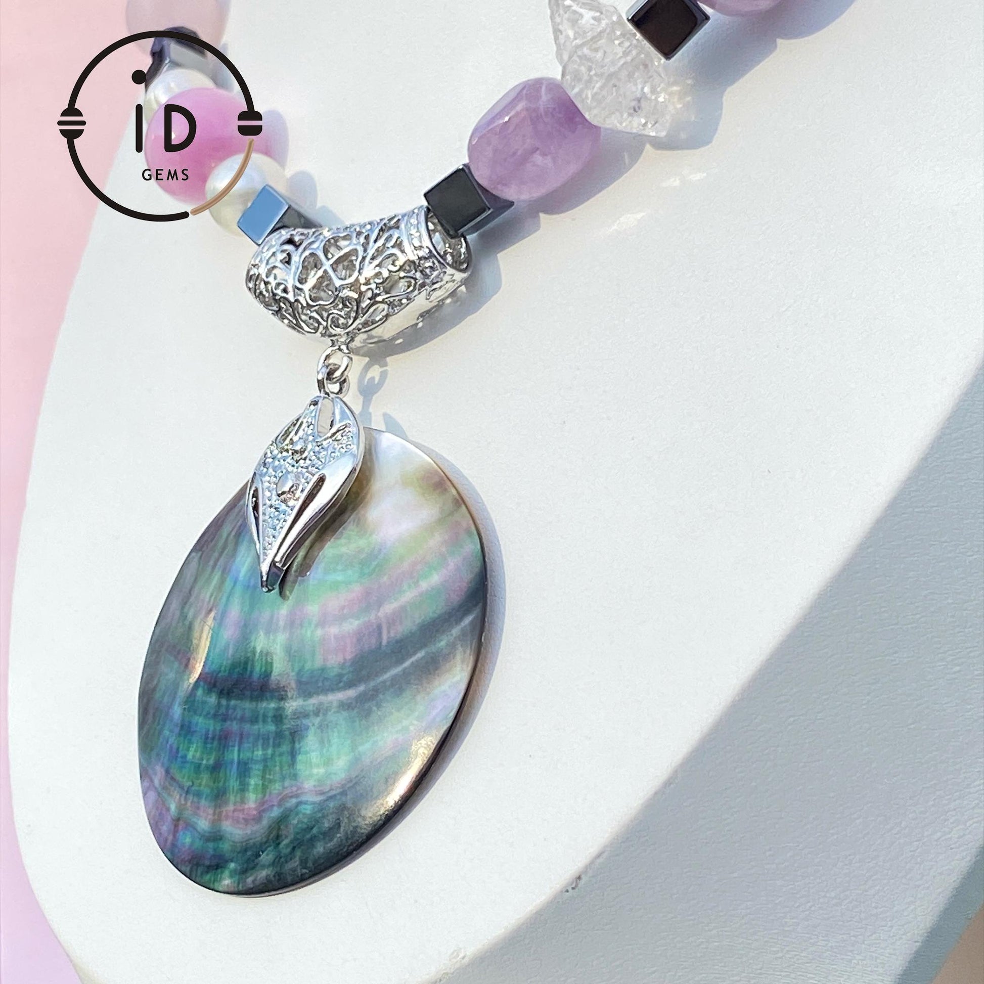 Hauptmaterialien: natürliche Muscheln, Fluorit, Amethyst, Disthen (Kyanit), Zirkon, Hämatit-Trennperlen