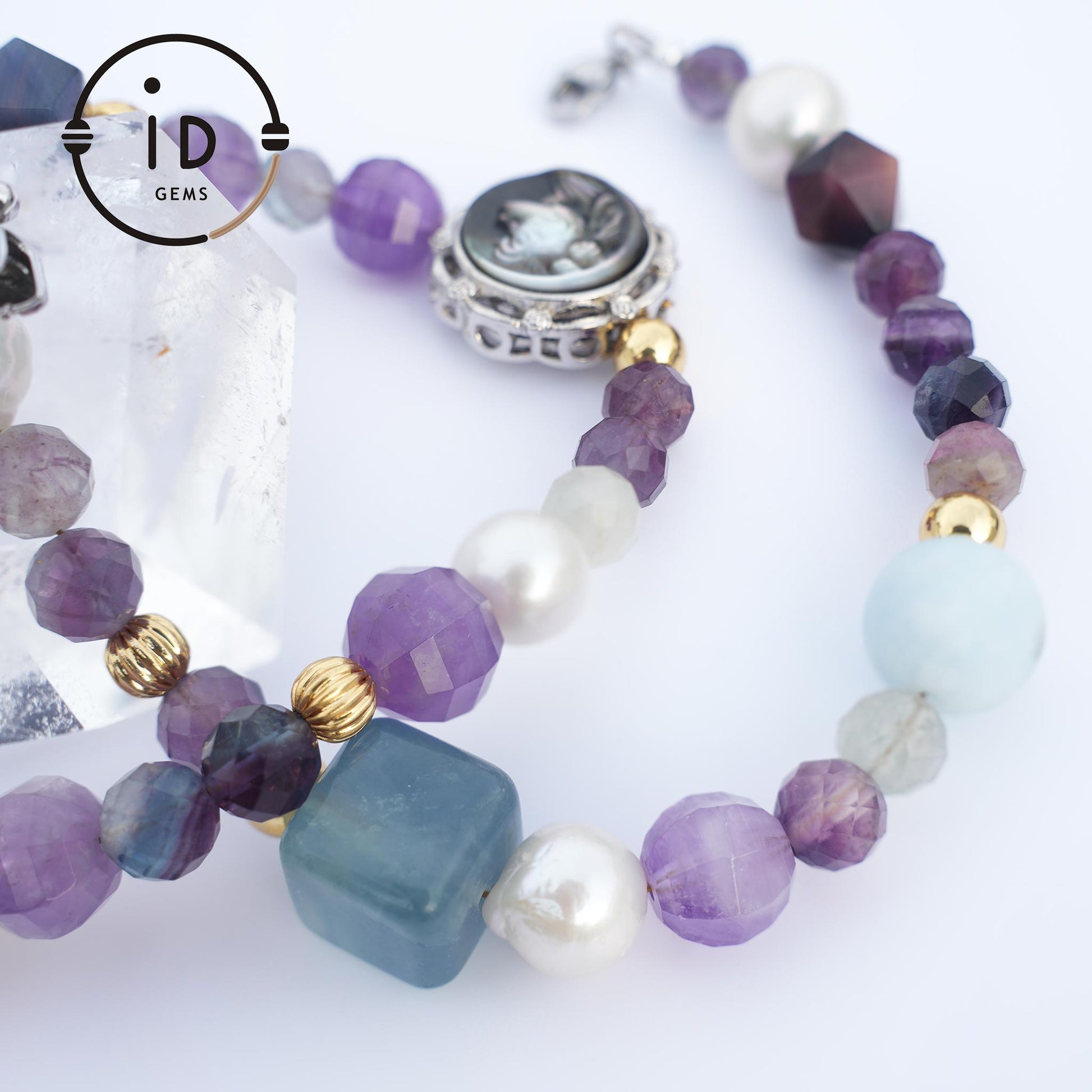 Hauptmaterialien: matte Fluoritperlen, Tigerauge, Sphalerit, Amethyst, Muschelschnitzerei , Aquamarin , Süßwasserperlen