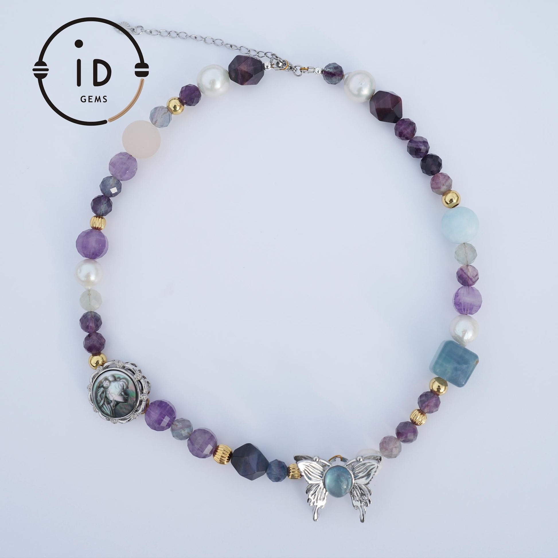 Spirituelles Design mit Kombination aus matten Fluoritperlen und Amethyst als Hauptsteinen, akzentuiert durch Tigerauge und Sphalerit, verziert mit zarten Engelsmuschel-Schnitzereien und Aquamarin-Schmetterlingsanhänger.
