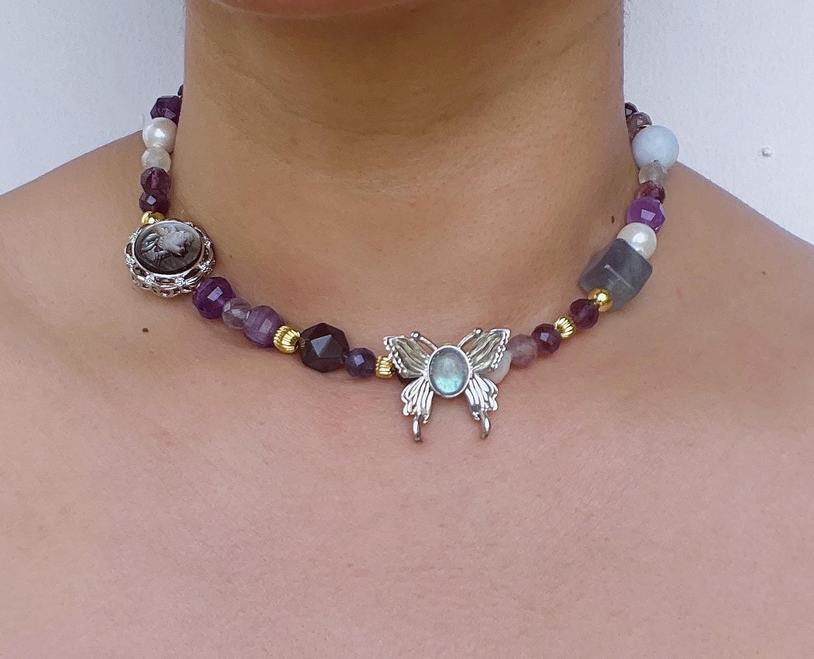 Schmetterling handgefertigte Perlenkette | Art Nouveau Vintage Anhänger | Bunte unregelmäßige Edelsteine | Freier Stil Kristallschmuck