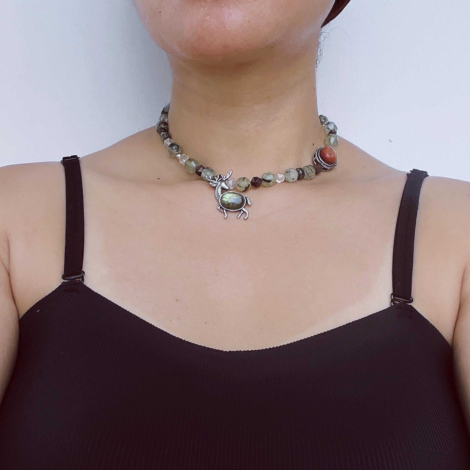 Grüner Quarz, Sonnenstein und Labradorit (Hirsch-Anhänger) begleiten dich, weben innere Balance und Licht zusammen und erinnern dich daran, den Moment zu schätzen und die Weisheit und Veränderung des Lebens zu umarmen.