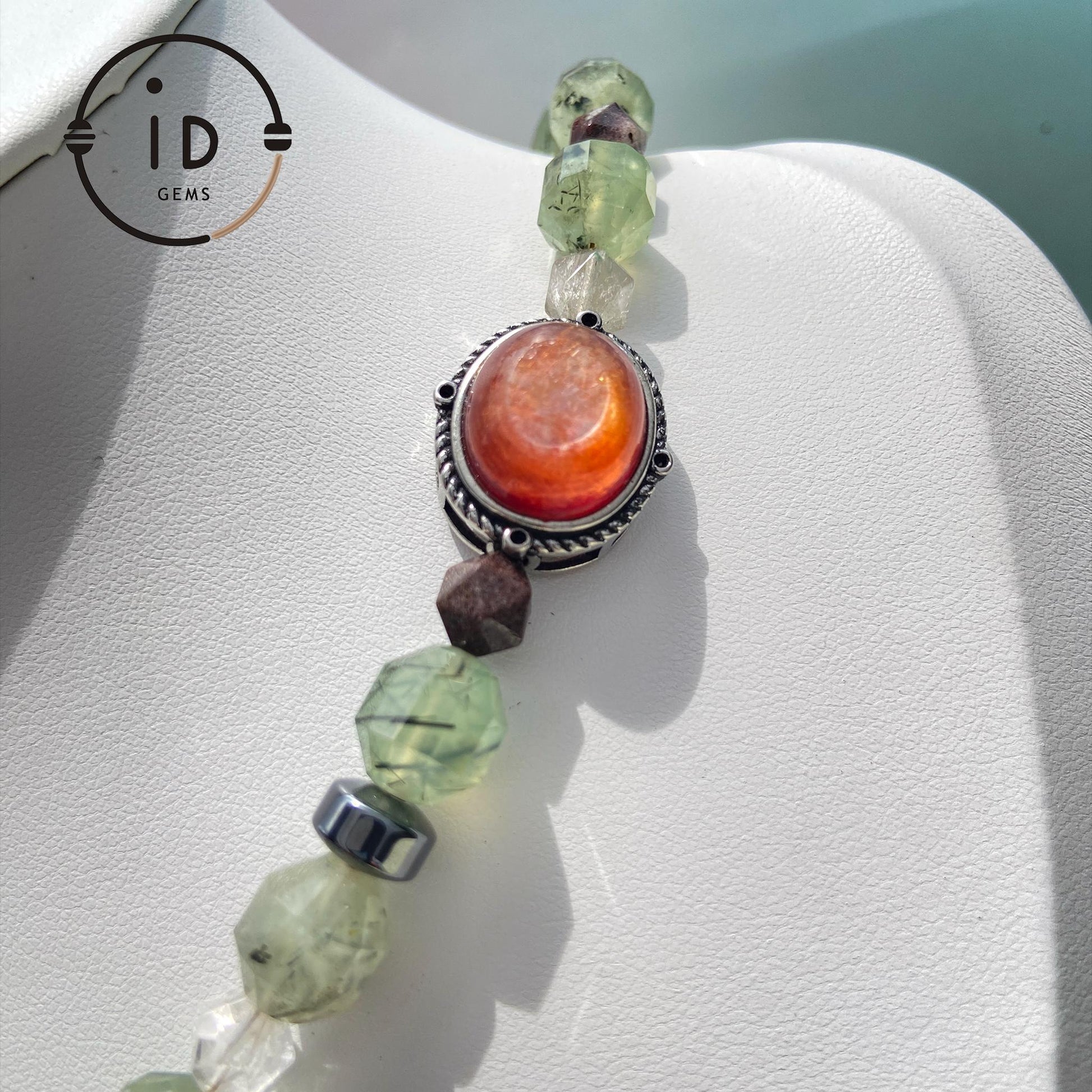 Hauptmaterialien: grüner Quarz, Sonnenstein, Labradorit (Hirsch-Anhänger), Hämatit-Trennperlen, Tigerauge, Fluorit