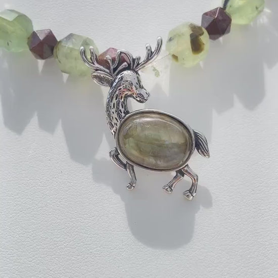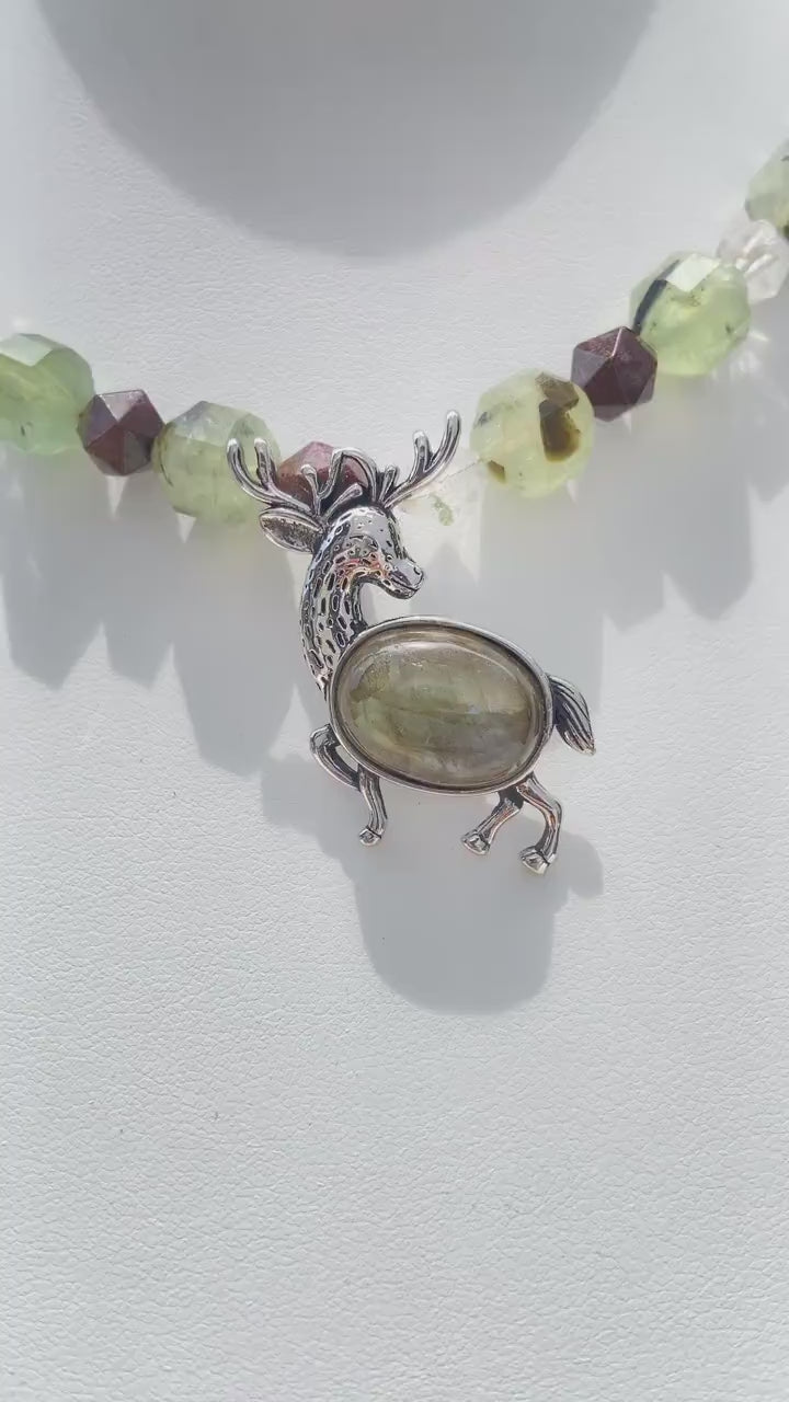 Spiritueller Naturalismus Hirsch Anhänger Halskette | Handgefertigtes Talisman-Design | Grüner Kristall & Labradorit Heilenergie Schmuck