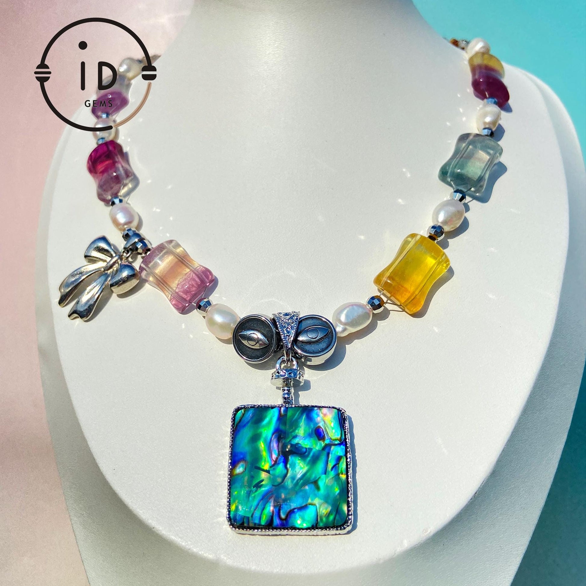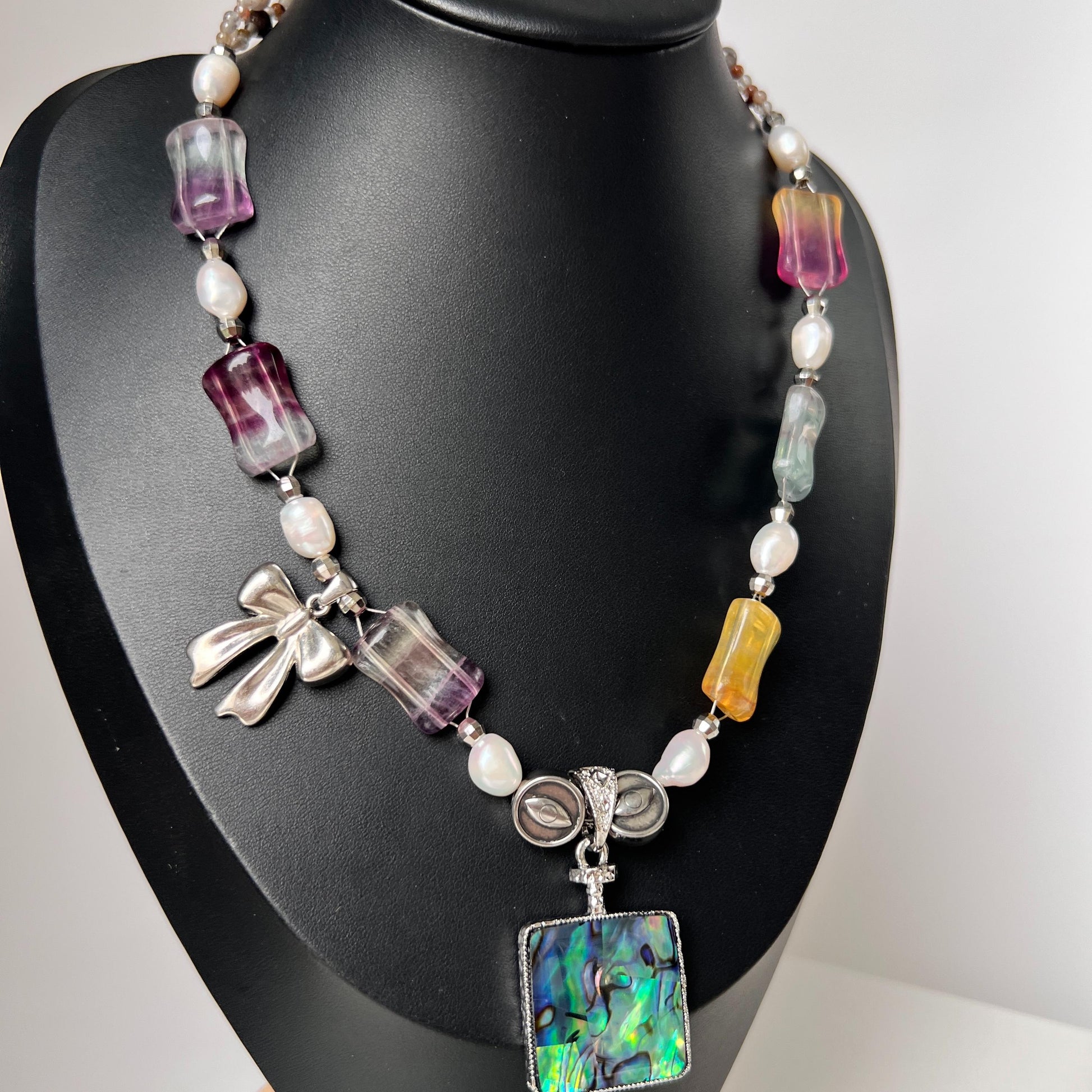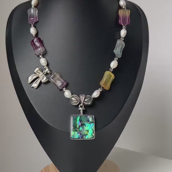 Diese farbenfrohe Statement-Halskette wurde mit viel Liebe zum Detail handgefertigt und vereint natürliche Regenbogen-Edelsteine, schimmernde Barockperlen und einen eindrucksvollen Anhänger aus Abalone-Muschel. Jedes Element reflektiert Licht auf einzigartige Weise - von zarten Pastelltönen bis hin zu intensiven Regenbogenfarben.