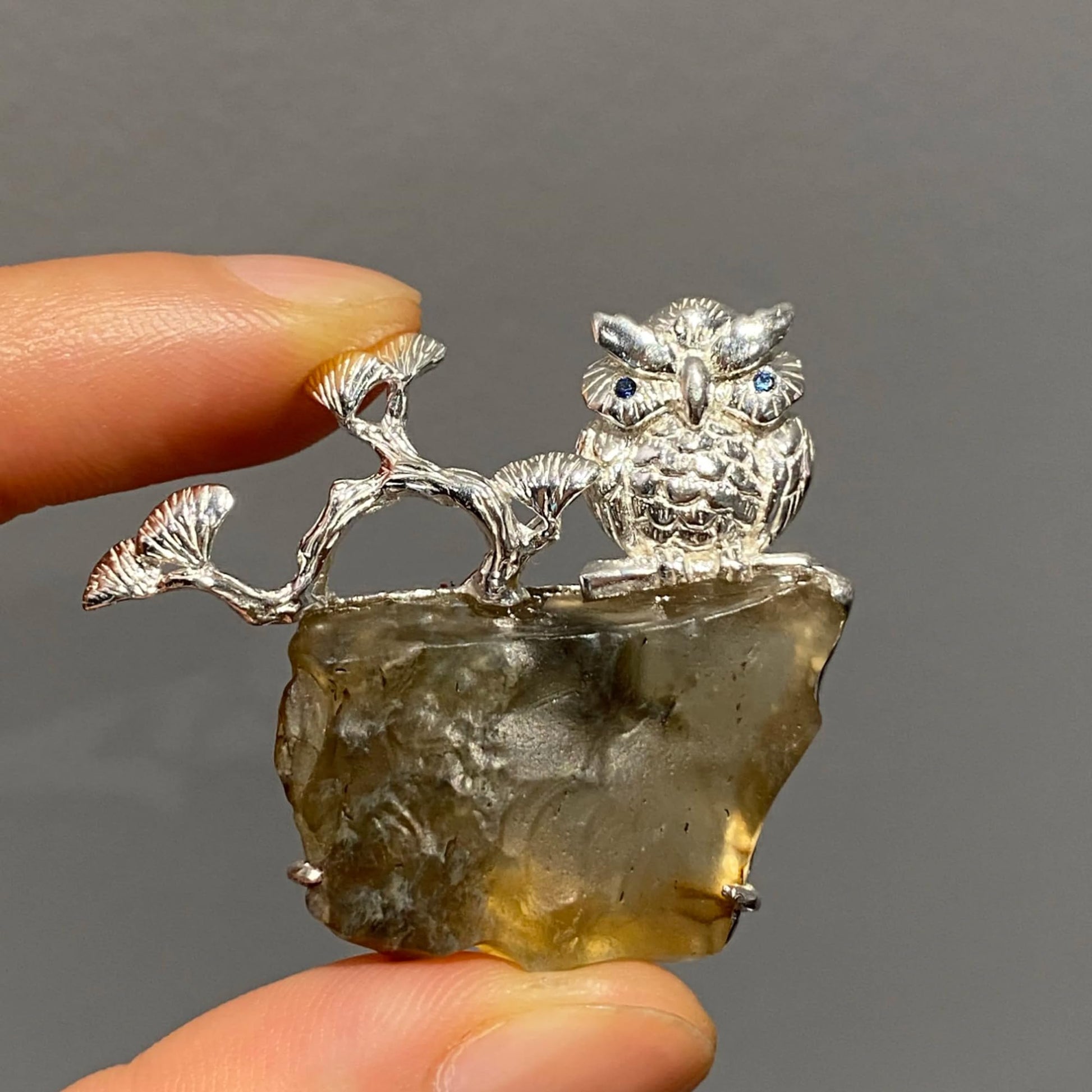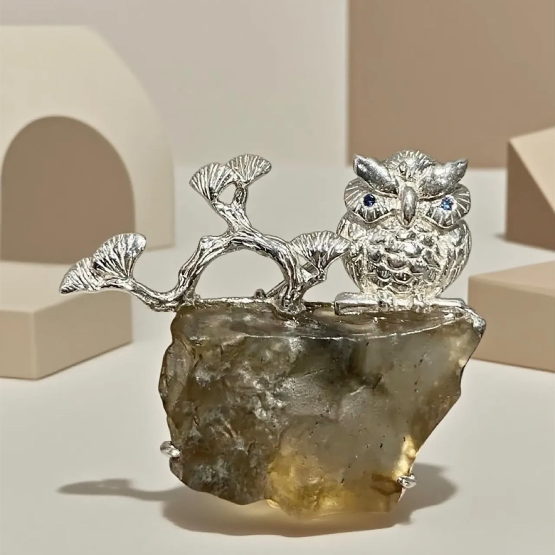 Die Eule gilt in Europa als Symbol der Weisheit, Intuition und inneren Stärke. Das Wüstenglas steht für Transformation und Schutzenergie. Zusammen bilden sie ein Schmuckstück mit tiefem spirituellem Charakter – perfekt für Alltag, Business oder Abendanlässe.