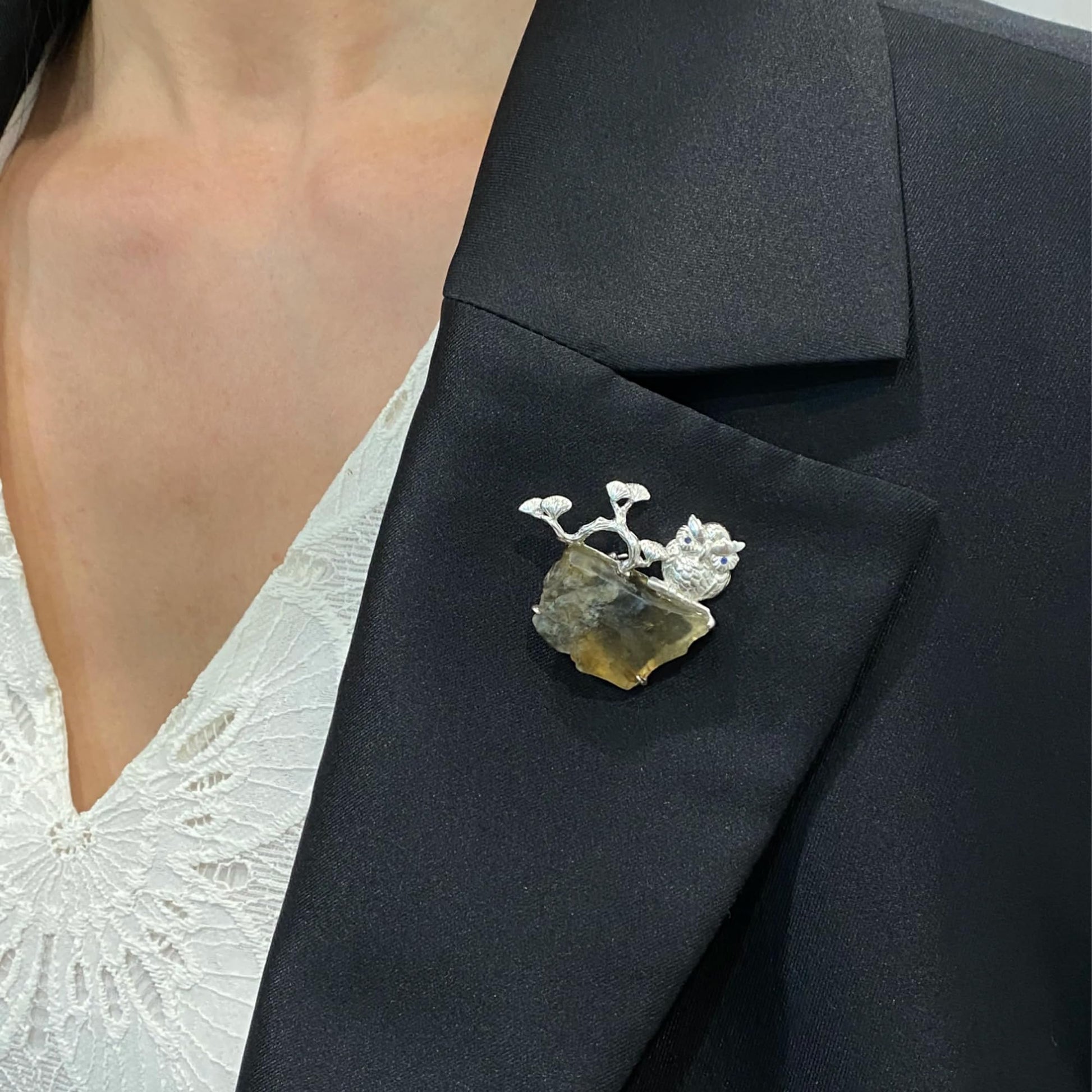 Die Eule mit Aststruktur ist fein modelliert, die Rückseite mit stabiler Broschennadel und Anhängeröse versehen.