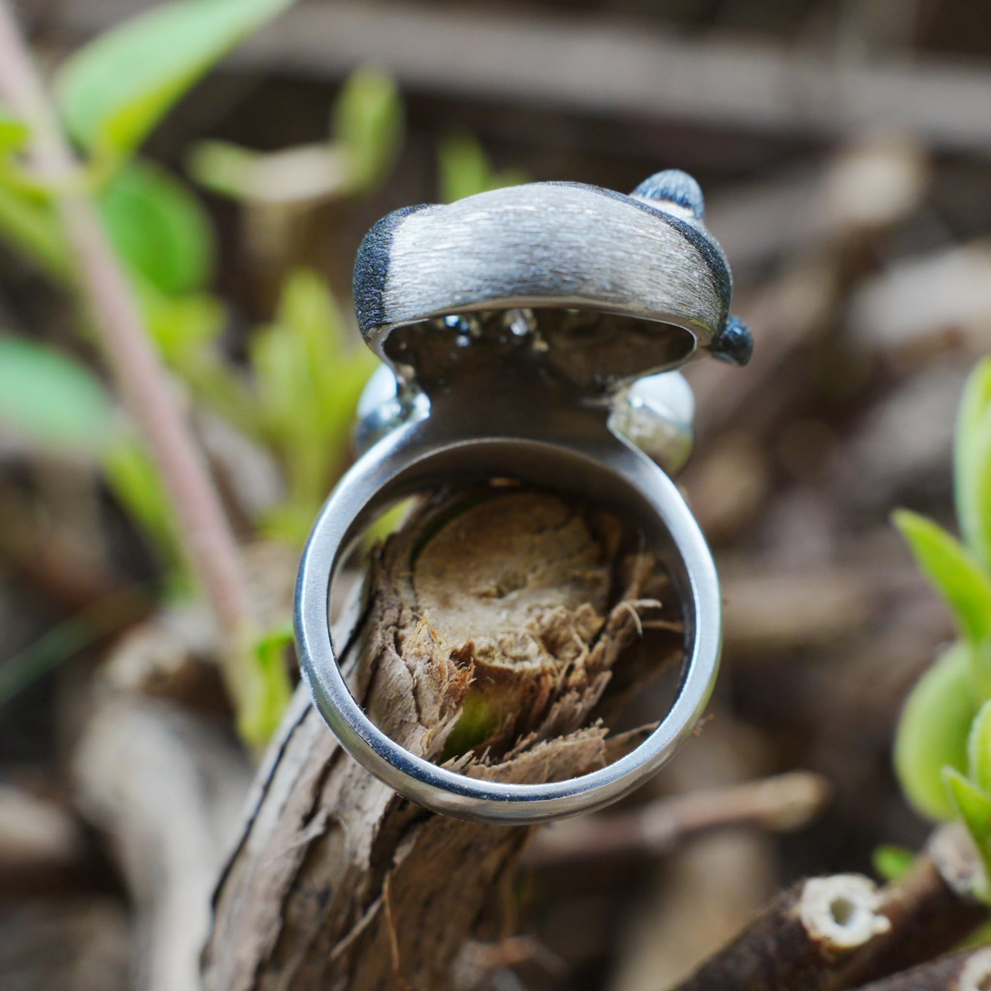 Die Kombination aus glänzender Silberstruktur und der sanften Schimmer der Perle macht jedes Stück zu einem Unikat.