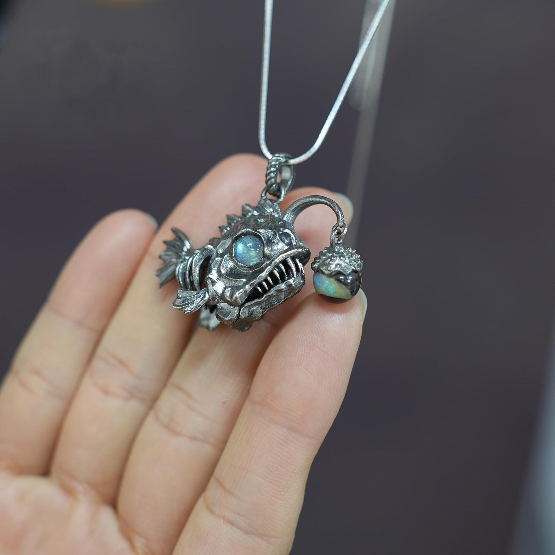 Anglerfish Pendant | 925 Sterling Silver & Labradorite Necklace | Handmade Ocean-Inspired Jewelry Gift for Sea Lovers & Collectors