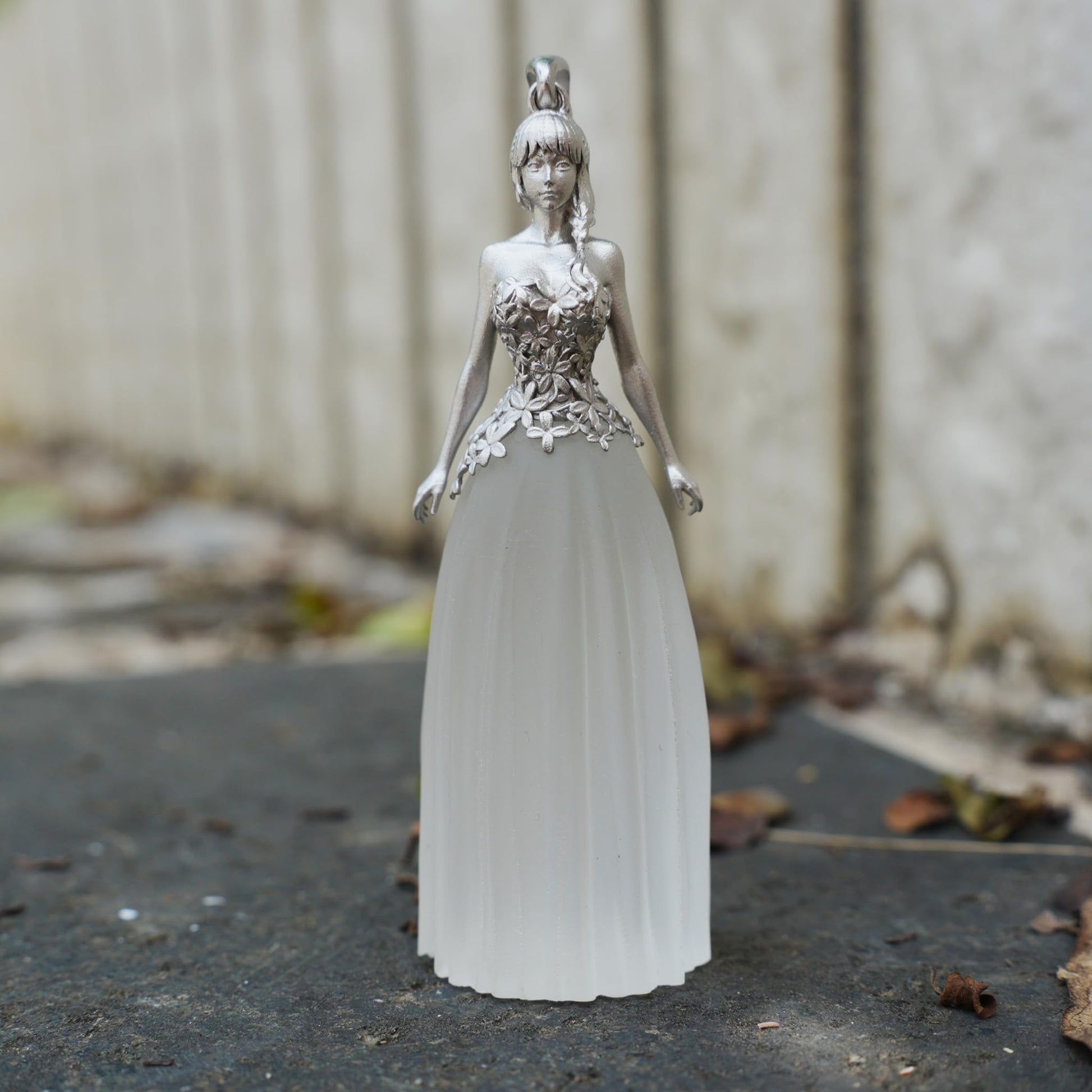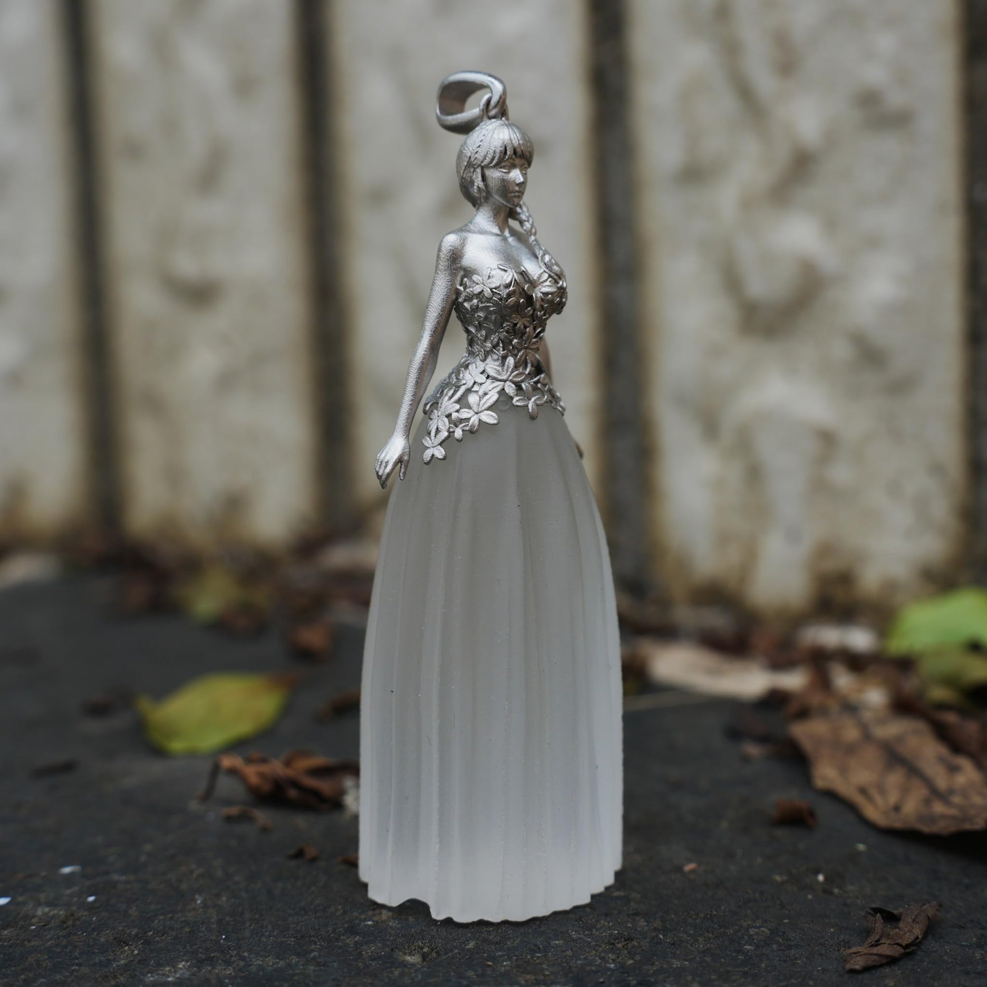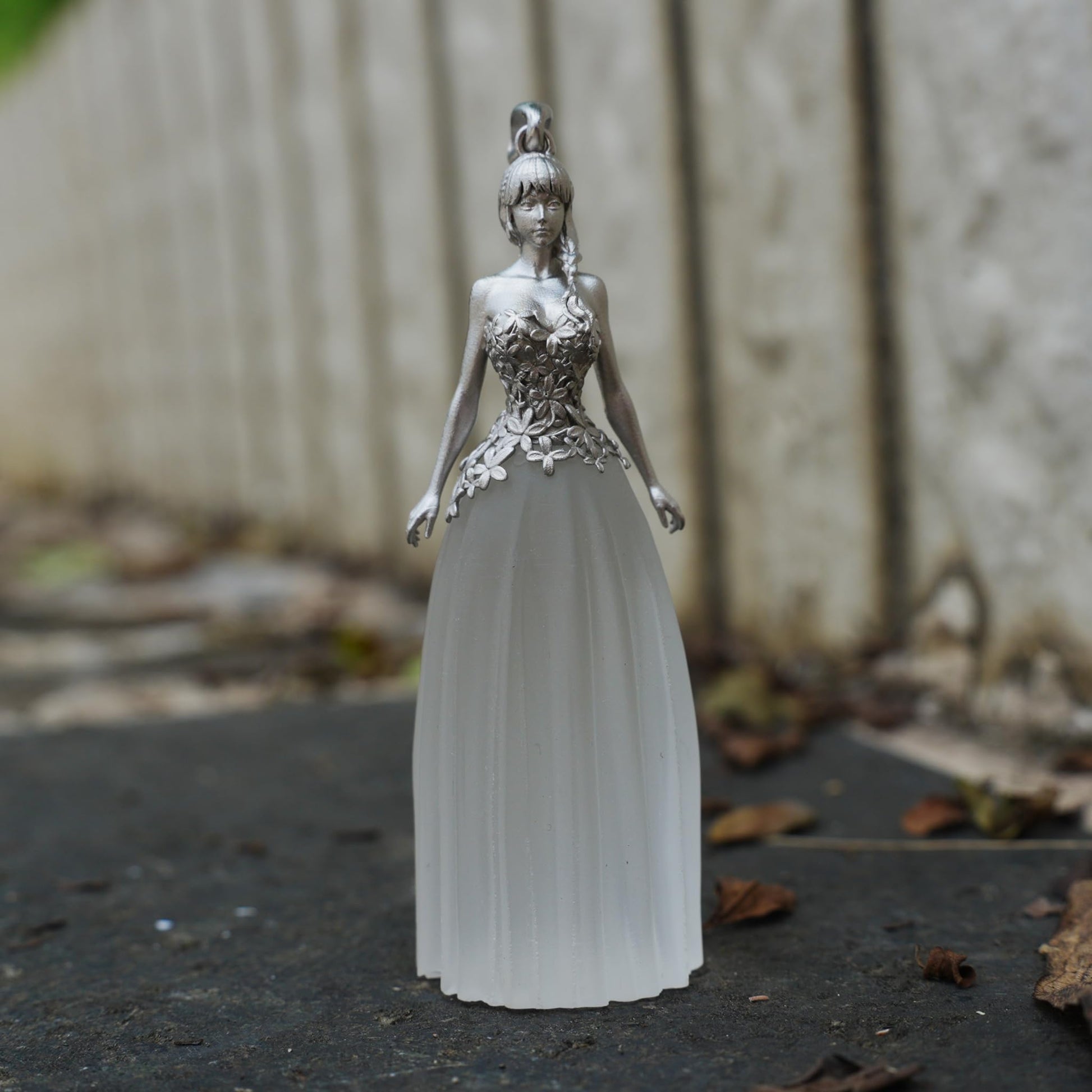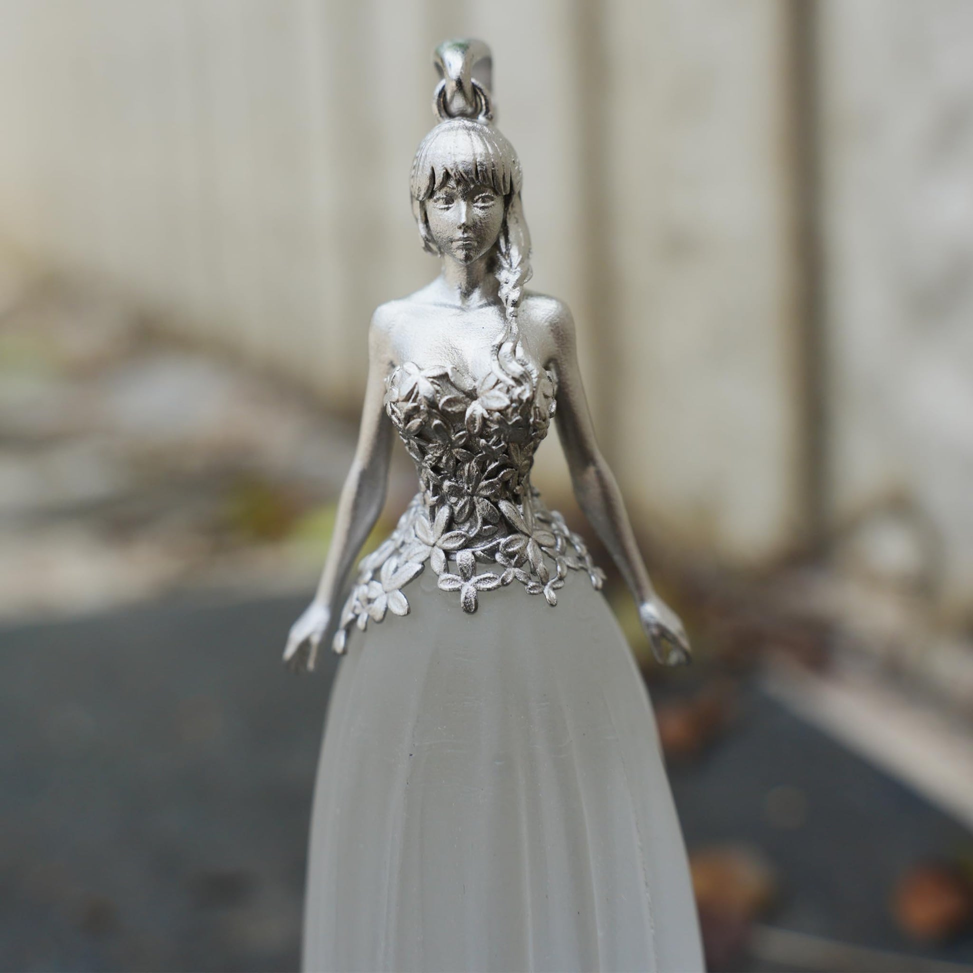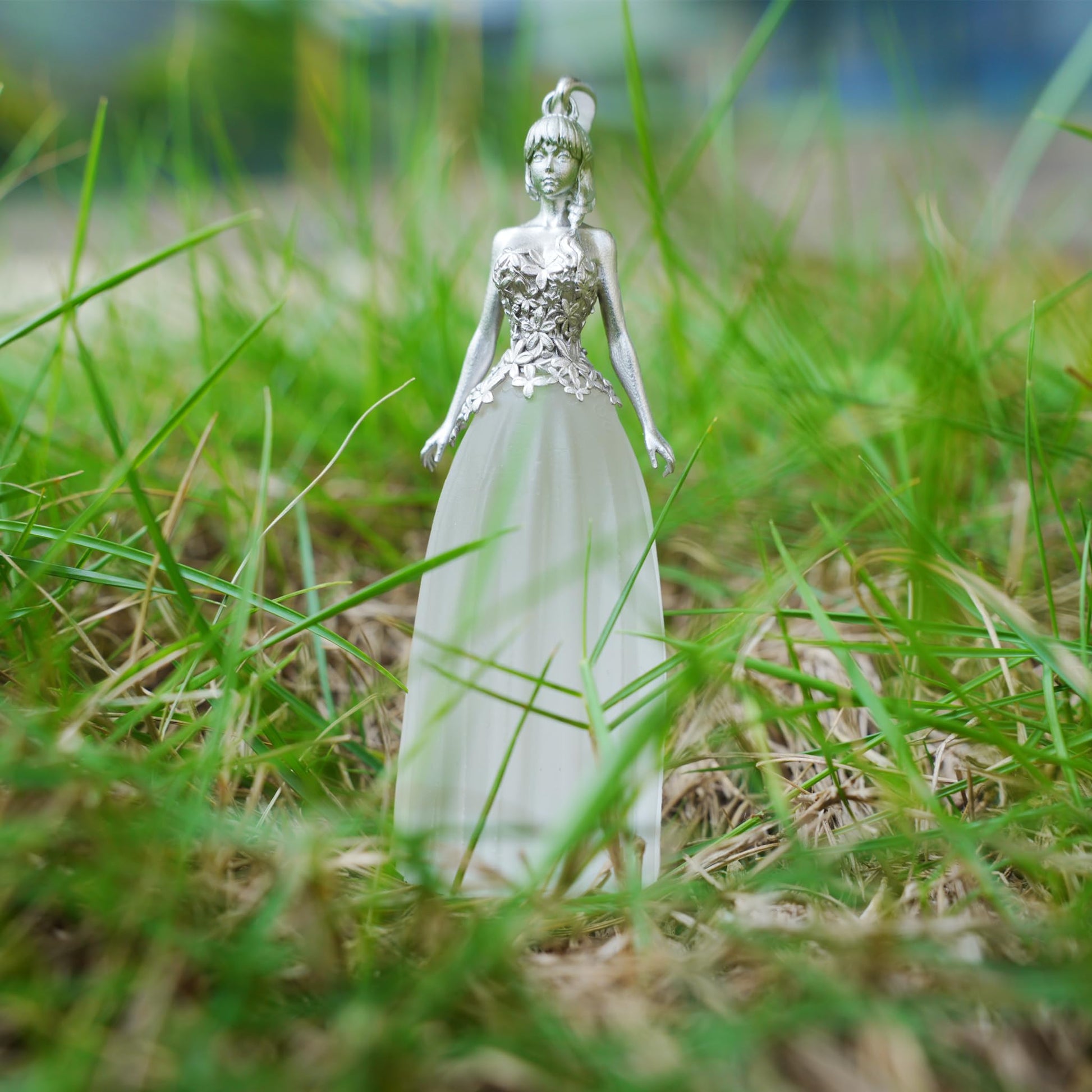 Her dress, carved from natural clear quartz, glows like frozen moonlight,