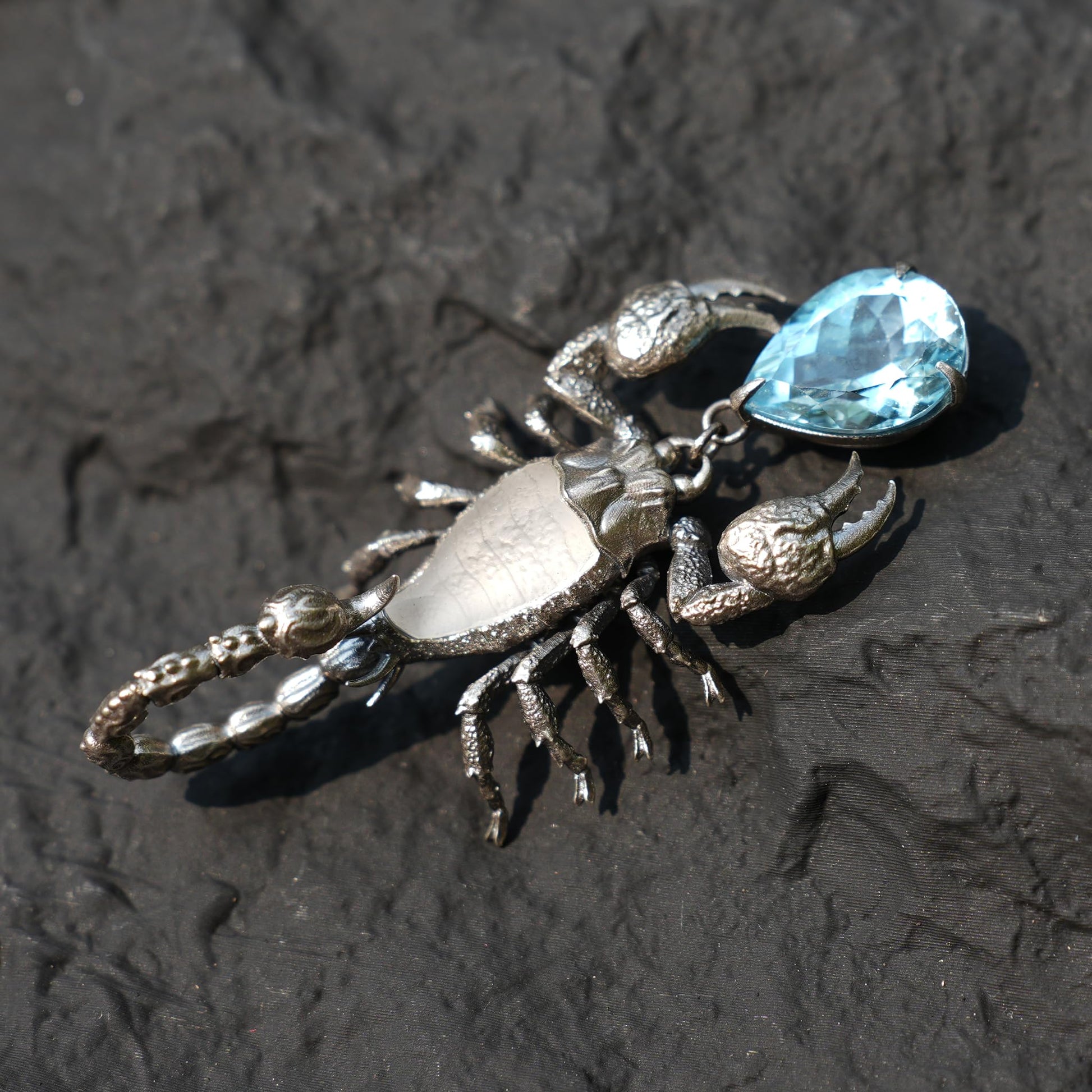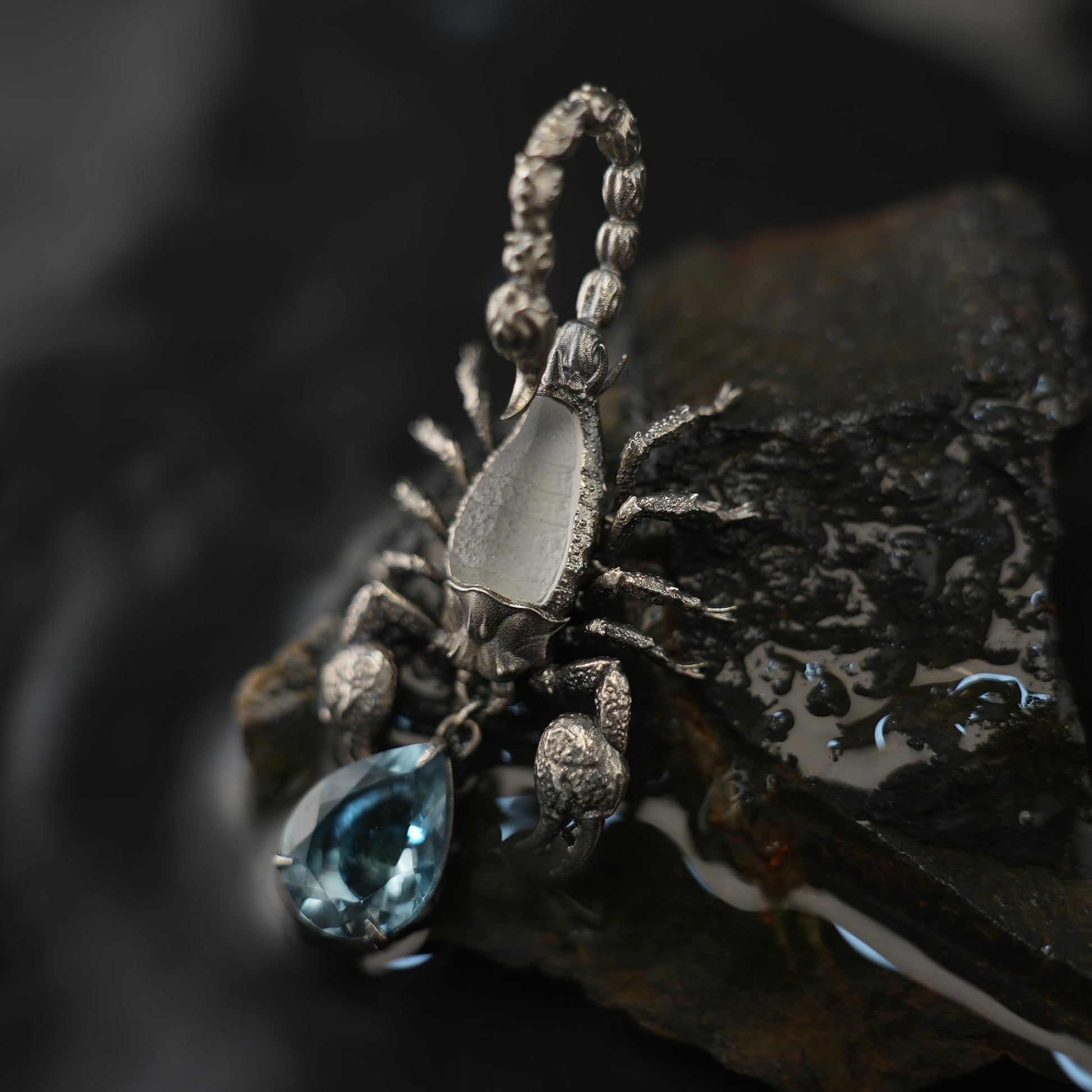 Forged from stardust and silver, the Stellar Scorpion Pendant carries a teardrop of blue topaz —