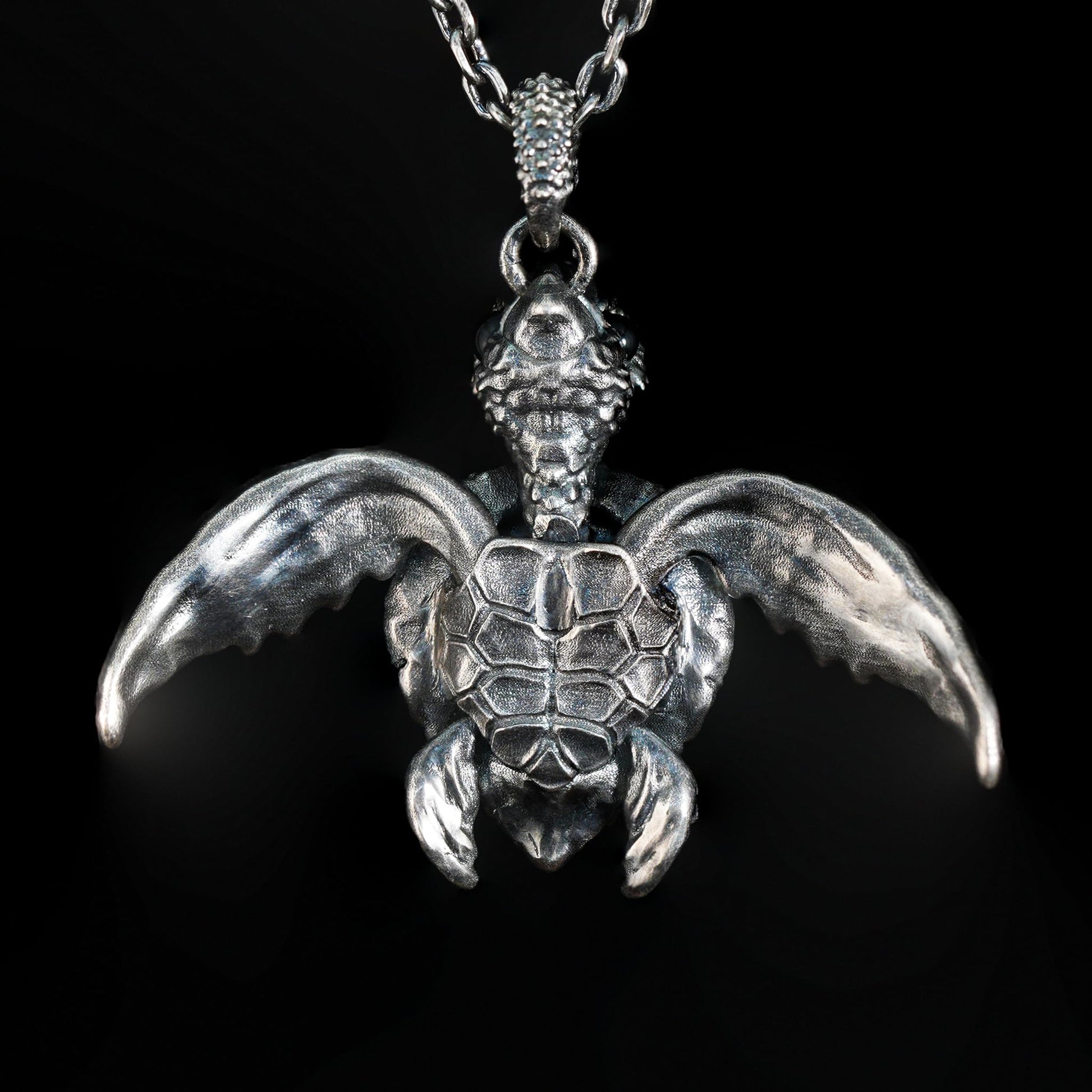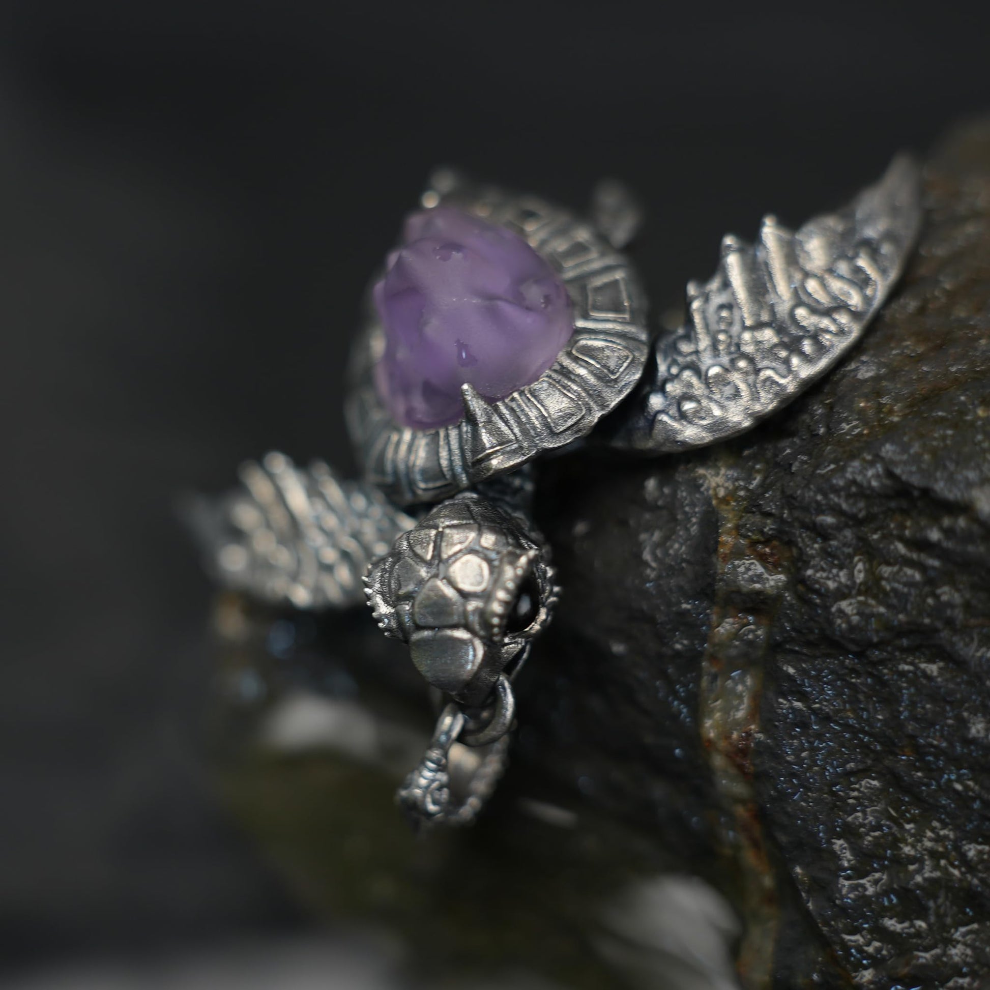 The designer merges the turtle’s sturdy shell with the fluid waves, crafting the shell from natural amethyst symbolizing the deep sea’s mystery and protective energy. The amethyst reflects gentle light like sunlight on the water, resembling the wise eyes of the turtle that have watched for centuries. This pendant blends mythological imagery with natural spirituality, embodying quiet yet powerful energy.