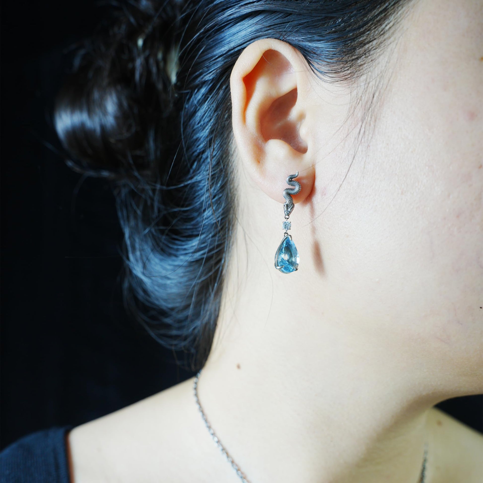 925 Sterling Silver Snake Drop Earrings with Aquamarine | Handcrafted Myth-Inspired Serpent Jewelry for Healing & Protection