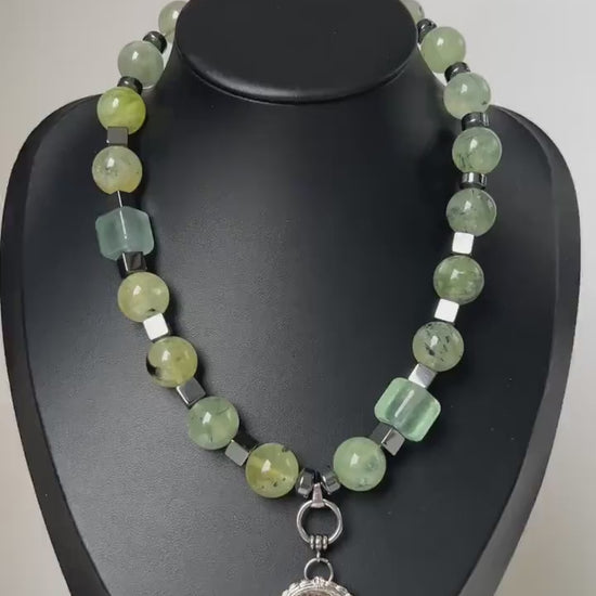 Diese handgefertigte Statement-Halskette ist ein kraftvolles Schmuckstück mit tiefer Symbolik und visueller Präsenz. Sie kombiniert große, runde Perlen aus grünem Naturstein, darunter grüner Phantomquarz, sowie quadratische Fluorit-Akzente in zartem Grün und glitzernde Zwischenperlen aus eisenhaltigem Gestein. Ein markanter Anhänger aus rotem Phantomquarz bildet das Zentrum der Kette und sorgt für einen ausdrucksstarken Kontrast. Die Metallteile - darunter ein unregelmäßiger OT-Verschluss - und die Gesamtstruktur wirken bewusst unregelmäßig, massiv und roh, was dem Schmuckstück eine rustikale, fast archaische Ausstrahlung verleiht.