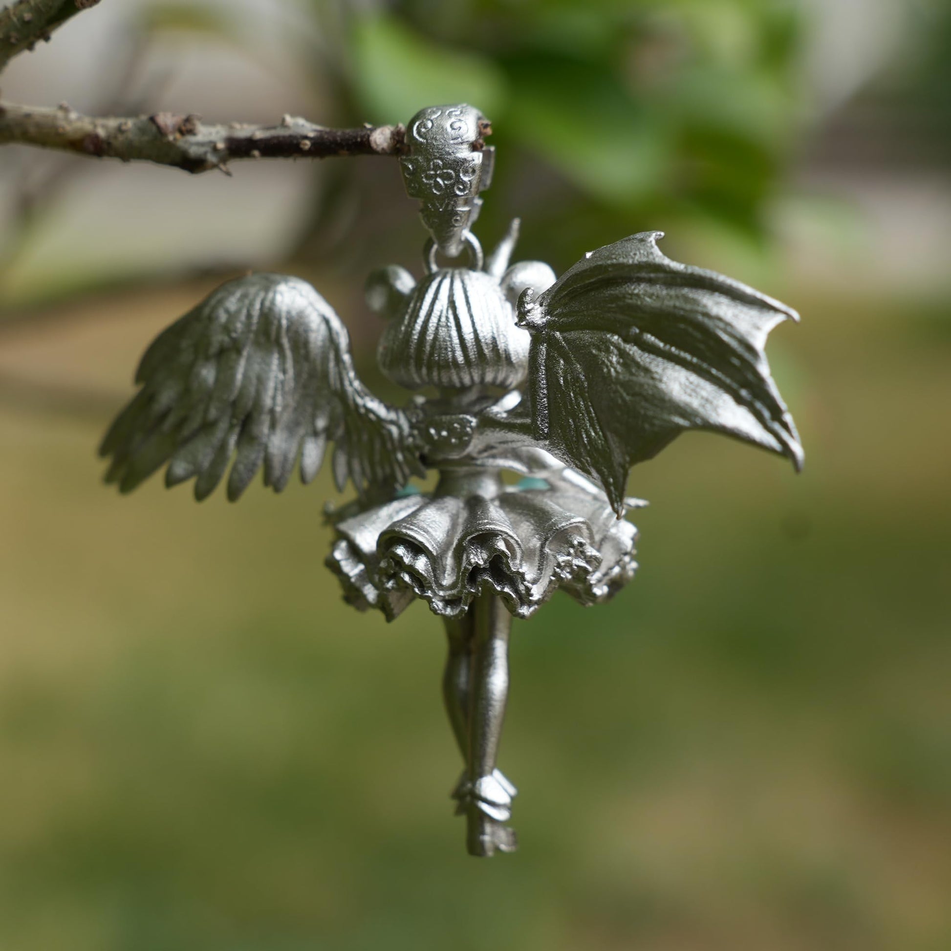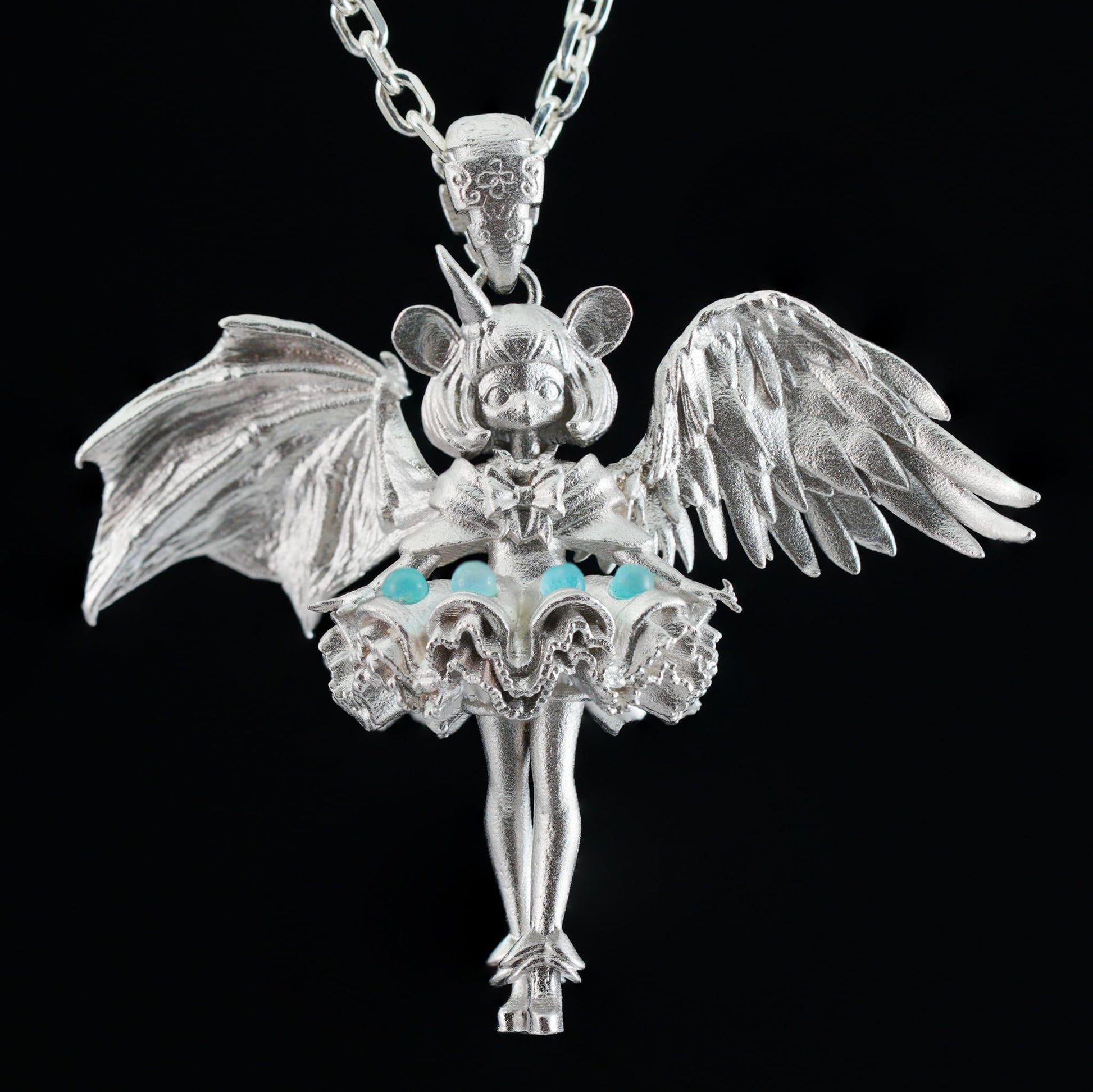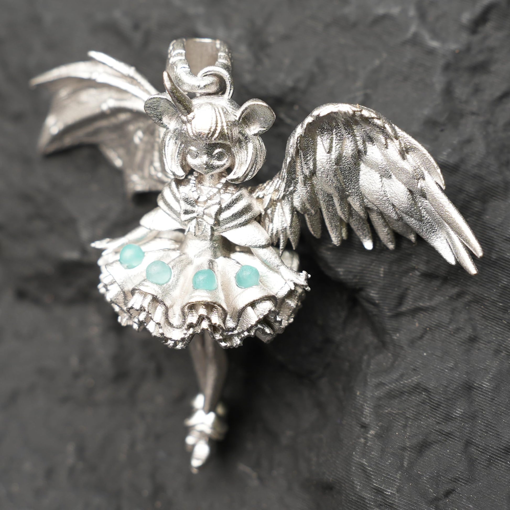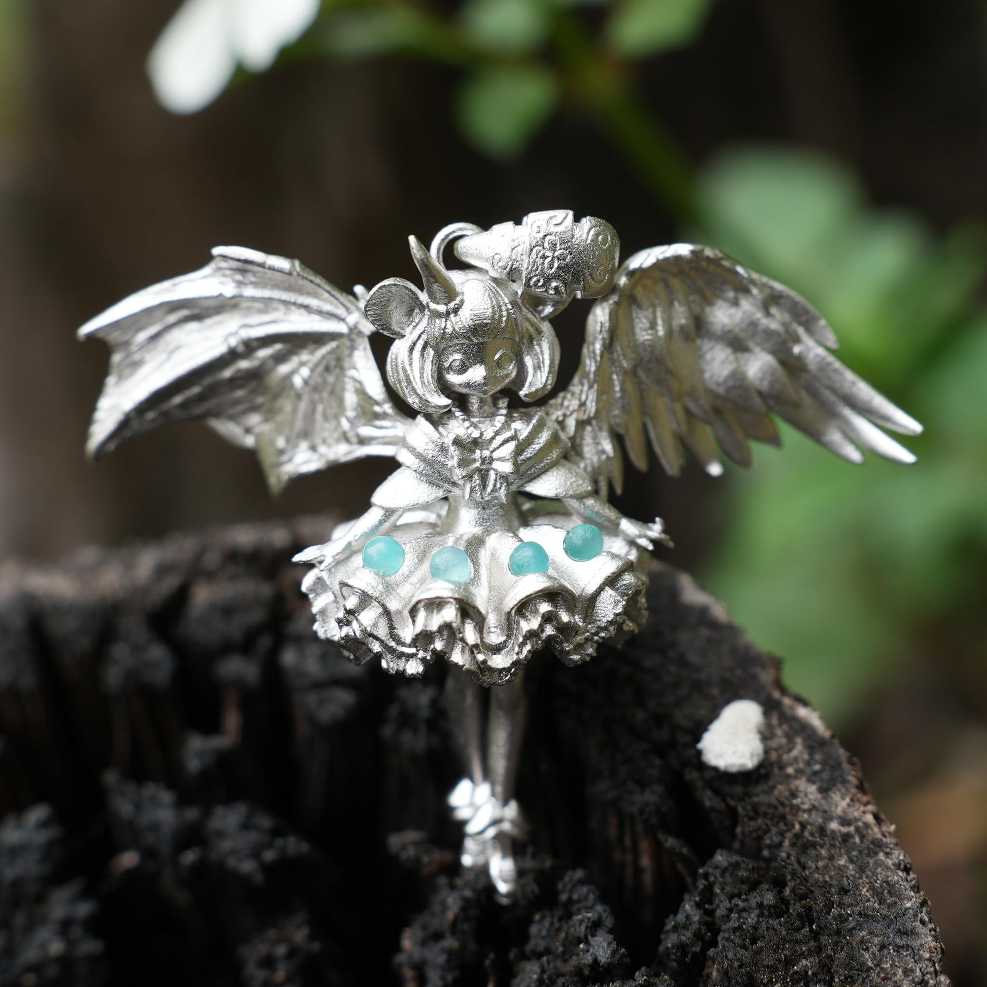 Design: Twin-winged guardian figure, skirt inlaid with gemstone “stars”