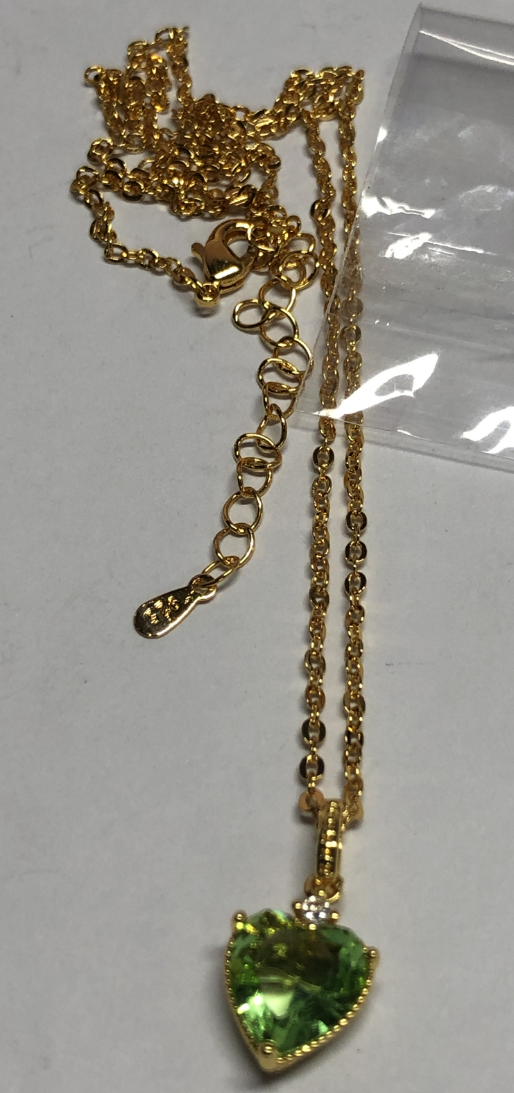 This charming necklace features a heart-shaped green synthetic gemstones set in a gold-toned pendant with delicate detail. The 23.5cm chain gently frames the collarbone, making it ideal for daily wear or meaningful gifting.