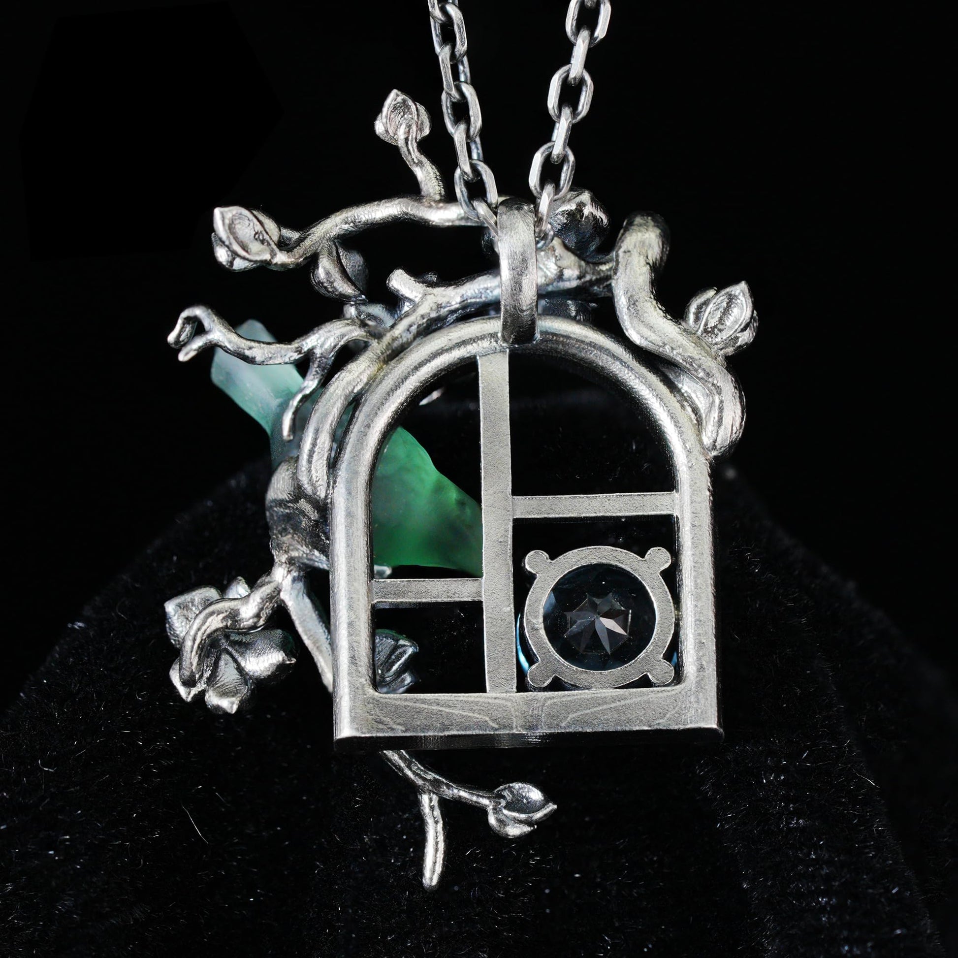 Green Bird Pendant Necklace at Window | Hand-Carved Silver Floral Bird Jewelry | Whimsical Springtime Gift for Nature Lovers and Dreamers